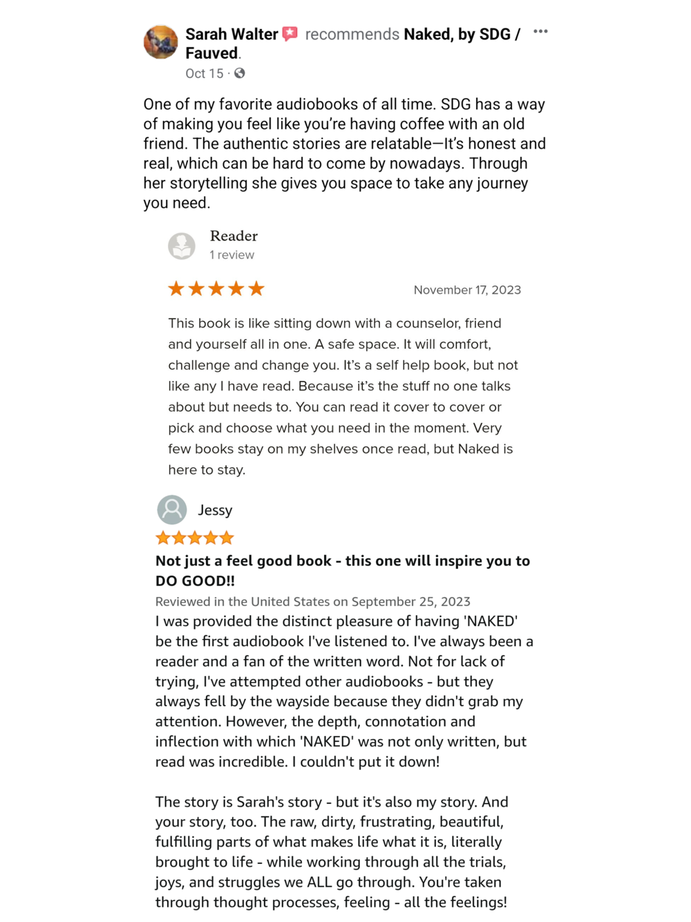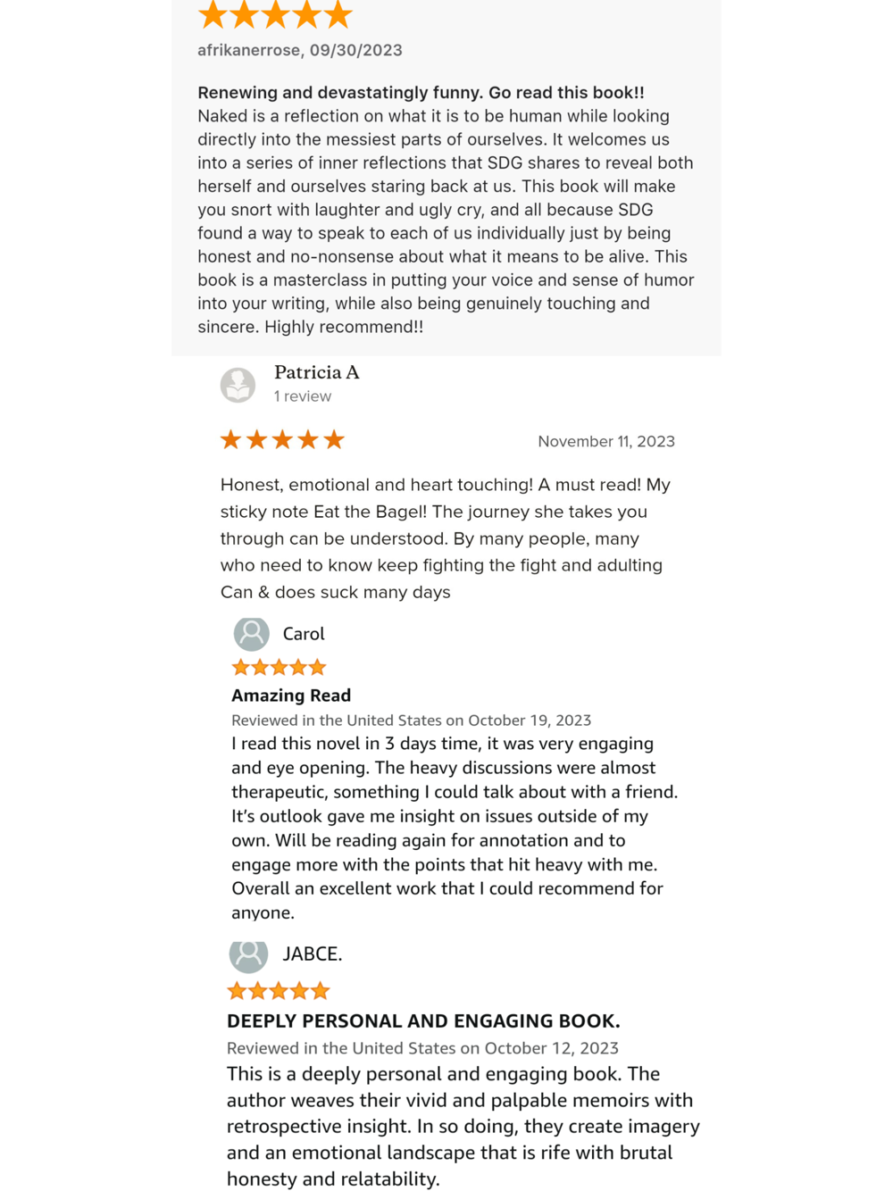 Naked is a collection of coming-of-middle-age essays that traverse a path from self-neglect to self-honoring. There is a rhythmic, lyrical quality to SDG’s debut, which poured out of her with urgency after years of being stuck in life’s holding patterns. From the smallest of life’s moments– a ceramic cup, a hug, a bagel– to life’s inexhaustible journeys– change, growth, love– SDG holds them all equally, bringing a level of emotional introspection and deeper wisdom that holds no pretense. Readers who cannot abandon their lives for a year of rest, reflection, and renewal will find solace in SDG’s approachable take on doing that work within their daily lives. She teaches that within our stories are choices– to question, to grow, to be brave.