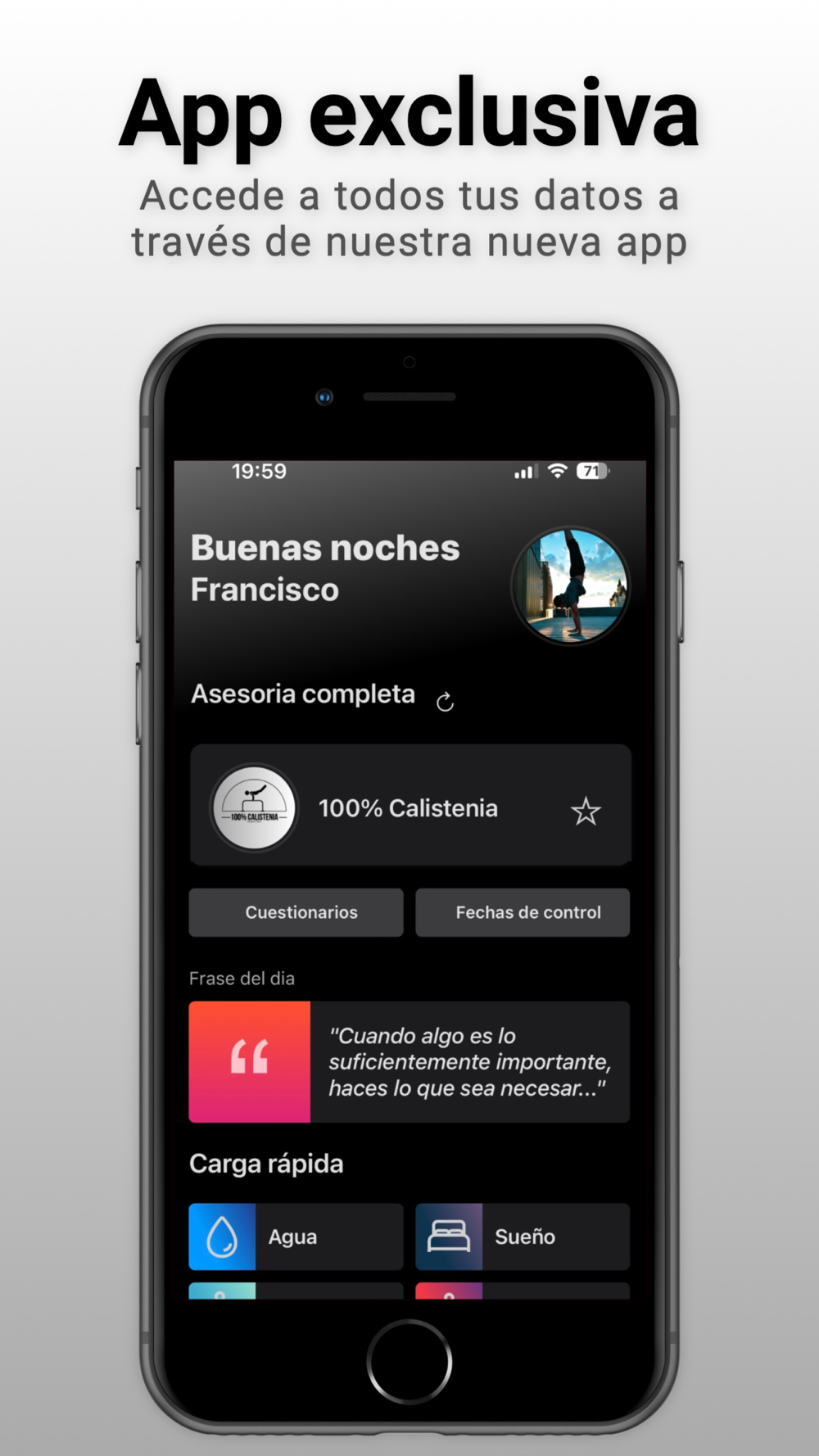 - App: Aplicación exclusiva en donde encontrarás tu plan de entrenamiento con videos de todos los ejercicios, recetas de comidas, registros de consumo de agua, calidad de sueño, peso corporal y mucho más.