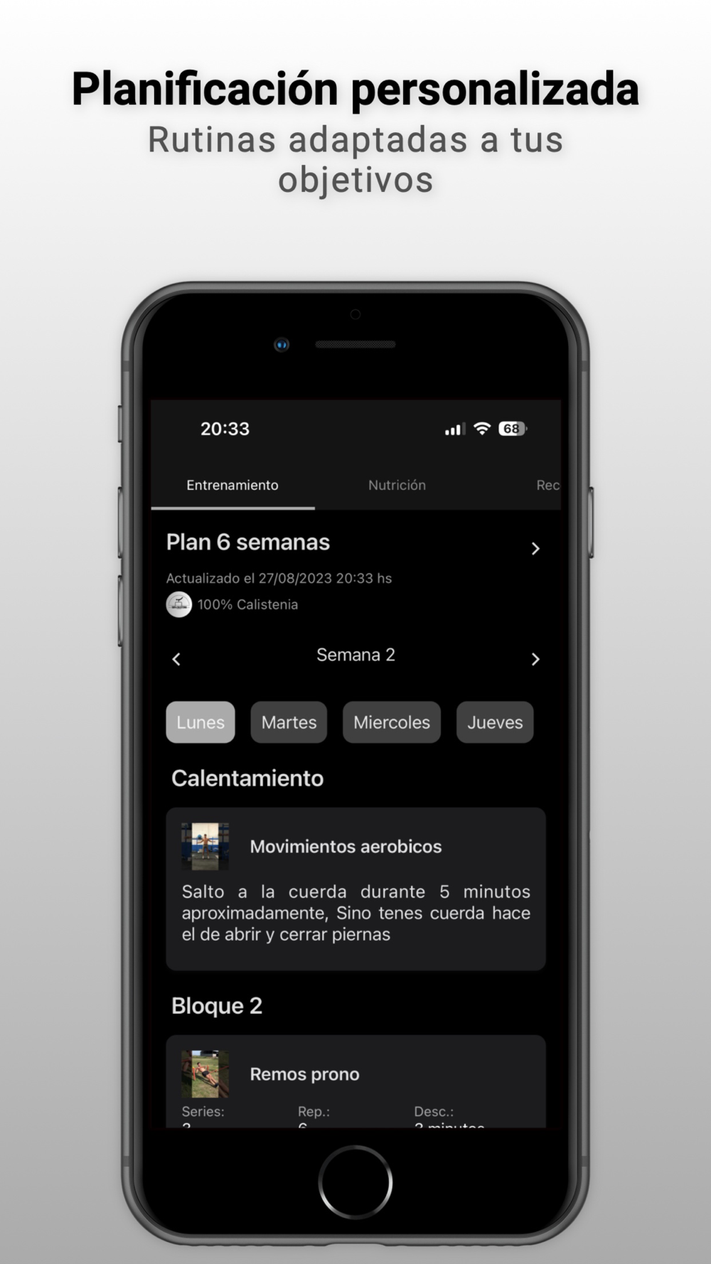 - Entrenamiento: rutina de ejercicios completamente adaptada a tus objetivos, capacidades y elementos de entrenamiento.