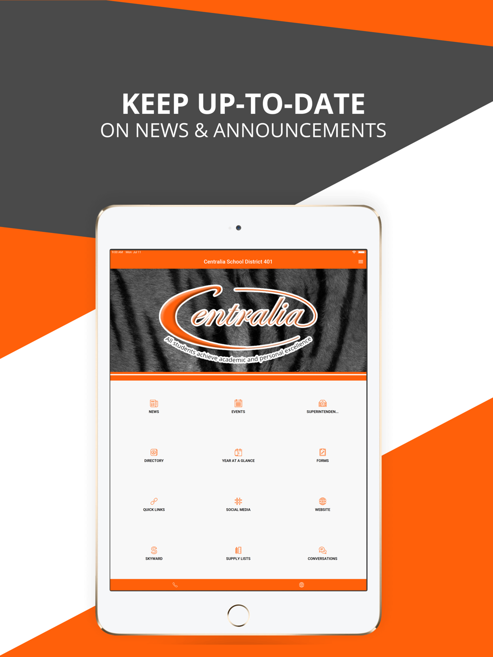 The Centralia School District 401 app by Edlio enables parents, students, teachers and administrators to quickly access the resources, tools, news and information to stay connected and informed!