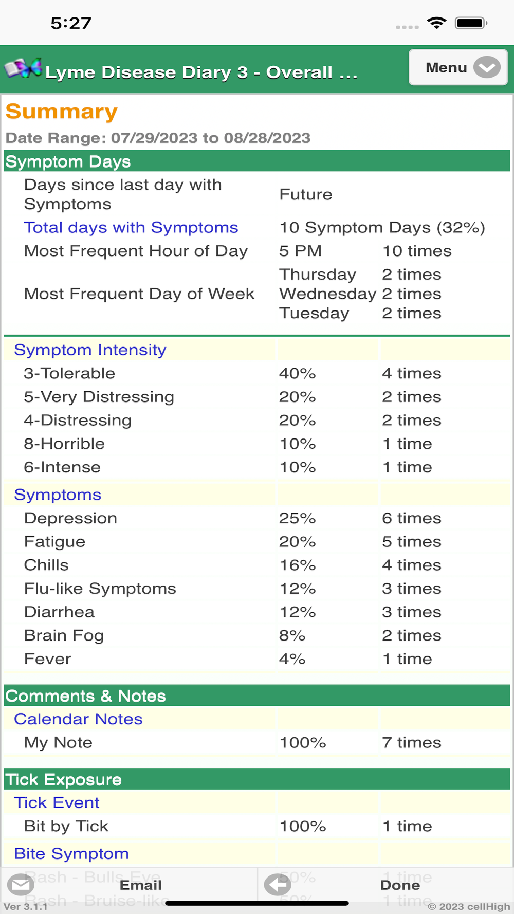 Are you like one of the millions of people who suffer from Lyme Disease? How can the Lyme Disease Diary help? The Lyme Disease Diary was designed to track information about you condition with a few screen taps. Using this information, the application will allow you to use triggers, like your stress, diet, day of week, etc to predict and manage your Lyme Disease Symptoms. The Lyme Disease Diary has a new “Trending and Forecasting” module that shows you which factors and triggers contribute to your symptoms. This will help you feel better and will allow you to take control of your symptoms. The Lyme Disease Diary makes it easy to perform tasks like tracking your treatment progress, graphing your patterns, emailing reports, including graphical attachments to your doctor and advisors. The Lyme Disease Diary will also allow you to export your data to a spread sheet all with just a few screen taps. Do you want all of your Lyme Disease health records and information at your fingertips so that you can start feeling better. The Lyme Disease Diary can help.