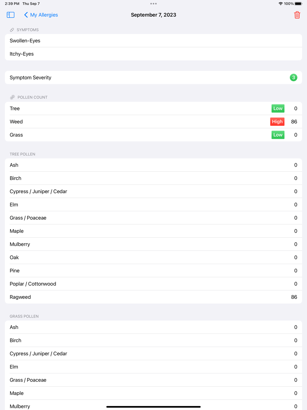 Trend Analysis: Visualize your allergy trends through intuitive charts, comparing symptoms over time and against varying pollen levels for a deeper understanding of your allergy landscape.