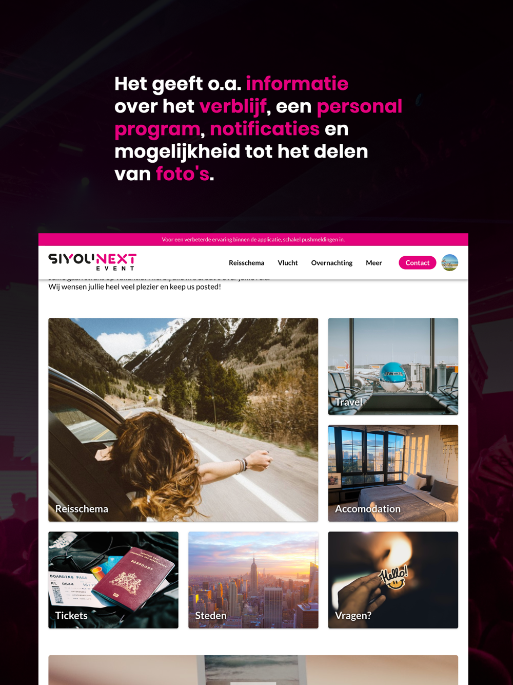 The SIYOUnext event app is currently being used successfully for corporate events, festivals and fairs. Optionally, the platform can be expanded with the SIYOUnext scanner for access control. How welcome do your guests feel? Hospitality is the key and this app can support the organization and personal communication with your guests of the event. What time do I fly? Where is my hotel? What time will my taxi arrive for the Champions League final? Interested in the SIYOUnext event app, please contact us!