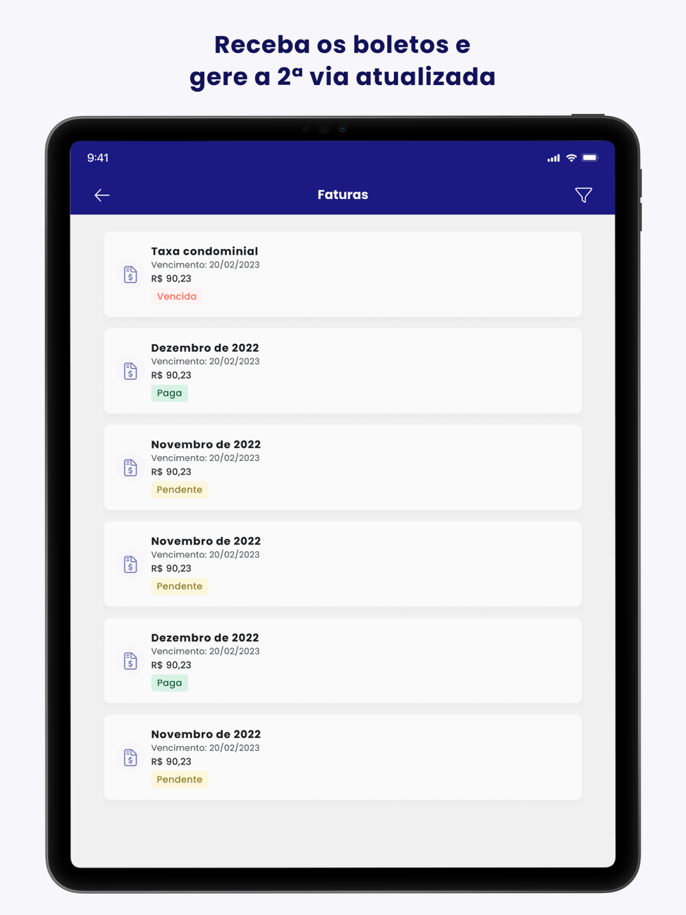 • FATURAS: Com a solução ALL Condo cada morador receberá a sua taxa de condomínio pelo aplicativo, facilitando tanto o controle quanto o pagamento (basta copiar o código de barras) e também o arquivamento dos pagamentos. Caso seja necessário, você pode, rapidamente, emitir a segunda via. Por meio dessa funcionalidade o síndico ou o gestor do condomínio tem acesso imediato às informações, podendo não só controlar o fluxo financeiro como também oferecer suporte para os moradores.
