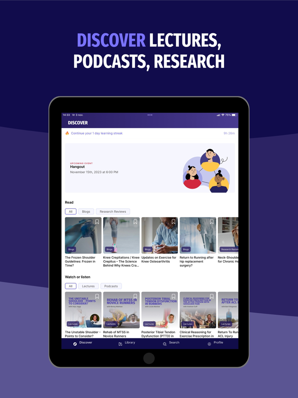 - Personalized Discover Feed: Tailor your learning experience with a Discover Feed customized to your interests. Stay updated with research reviews, blogs, video lectures, podcasts, live events, and certified courses. Your learning, your way.