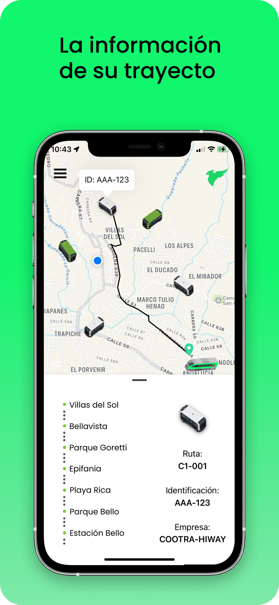 Al tocar el ícono de un vehículo, accede a sus detalles específicos: identificación y recorrido. Además, comparte tu ubicación en paradas de bus para contribuir al mejoramiento de rutas en tu área.