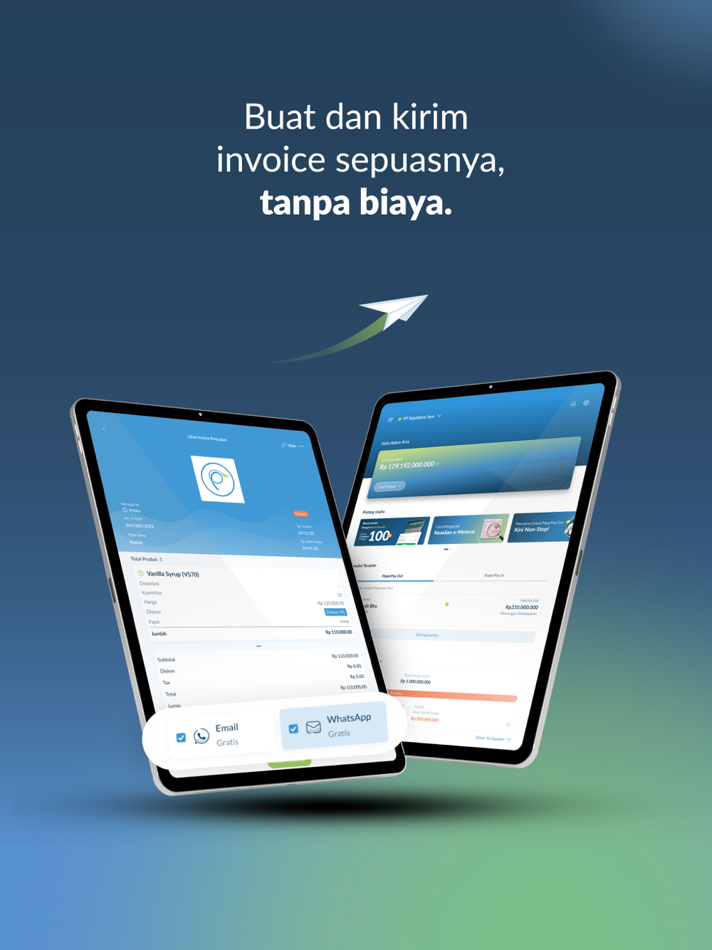 Rasakan kemudahan di setiap transaksi bisnis Anda dari tagih dan terima pembayaran serta kontrol tempo, semua dalam satu genggaman. Kelola transaksi bisnis Anda lebih mudah dengan Paper.id