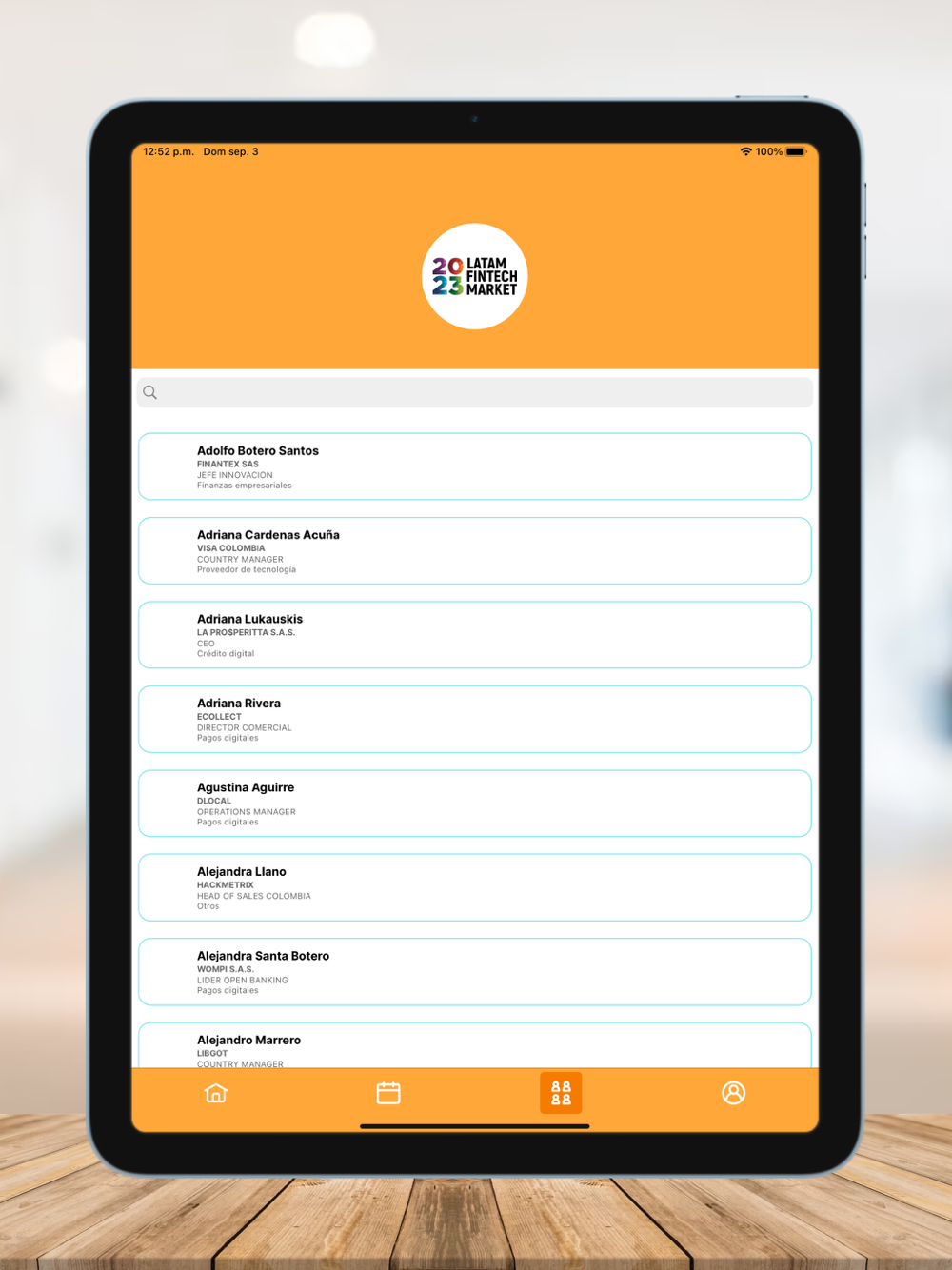 Con la aplicación LATAM FINTECH MARKET tienes acceso a la información y red exclusiva de personas que asisten al evento de cada año. La aplicación cuenta con el listado general de las personas, quienes podrán hacer contacto entre ellas y agendar reuniones en diferentes salas y horarios. Muestra las empresas patrocinadoras en sus diferentes categorías, los conferencistas y descripción de su participación, agenda del evento y listado de empresas expositoras en muestra comercial.