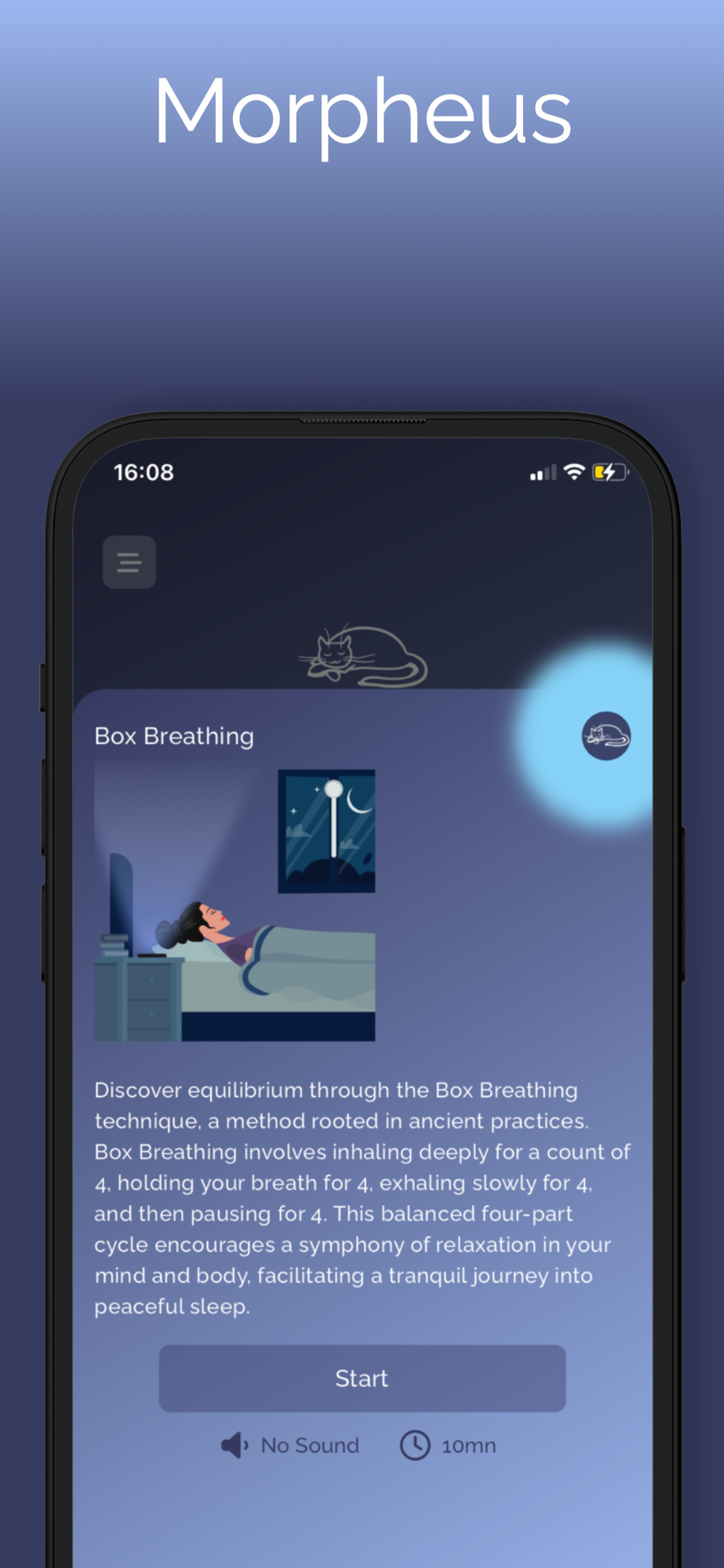 Welcome to Morpheus – your ultimate sleep companion! Are you tired of tossing and turning, struggling to find your way into a peaceful slumber? Look no further! Morpheus is here to help you breathe, relax, and sleep like never before. Our innovative app harnesses the power of soothing breathing techniques and the ambient glow of your phone's brightness to guide you towards a restful night's sleep. With Morpheus, drifting into dreamland has never been easier.