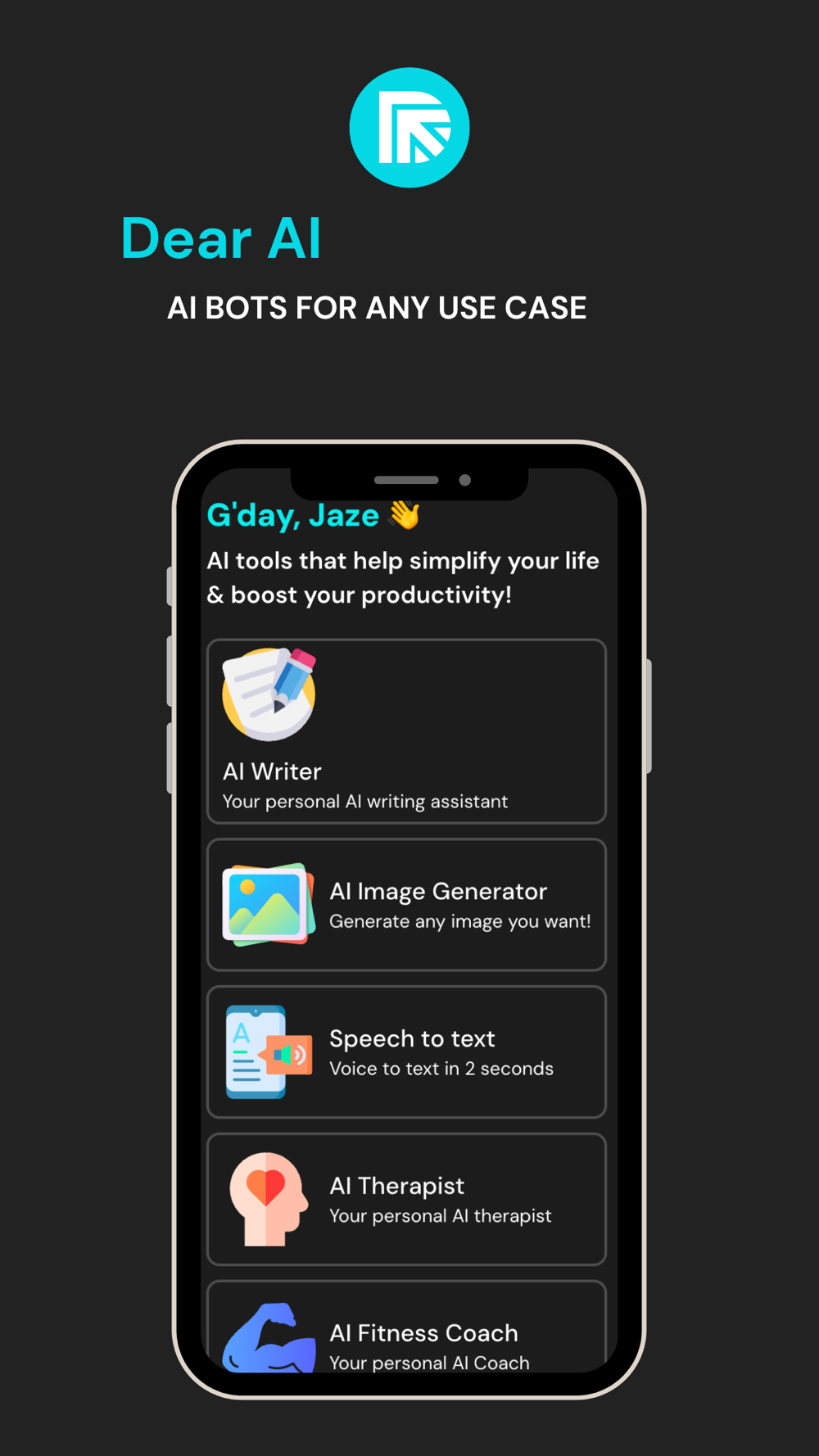 Introducing Dear AI, the perfect AI companion to optimize your everyday activities. Dear AI is a revolutionary Al chatbot powered by ChatGPT. Discover the new way of communication and productivity boost with AI, a cutting-edge Al-powered chatbot designed to revolutionize the way you interact, learn, and achieve your goals. Powered by OpenAl's advanced technology, Dear AI is here to become your ultimate personal assistant, friend, and conversational partner, all in one easy-to-use app.
