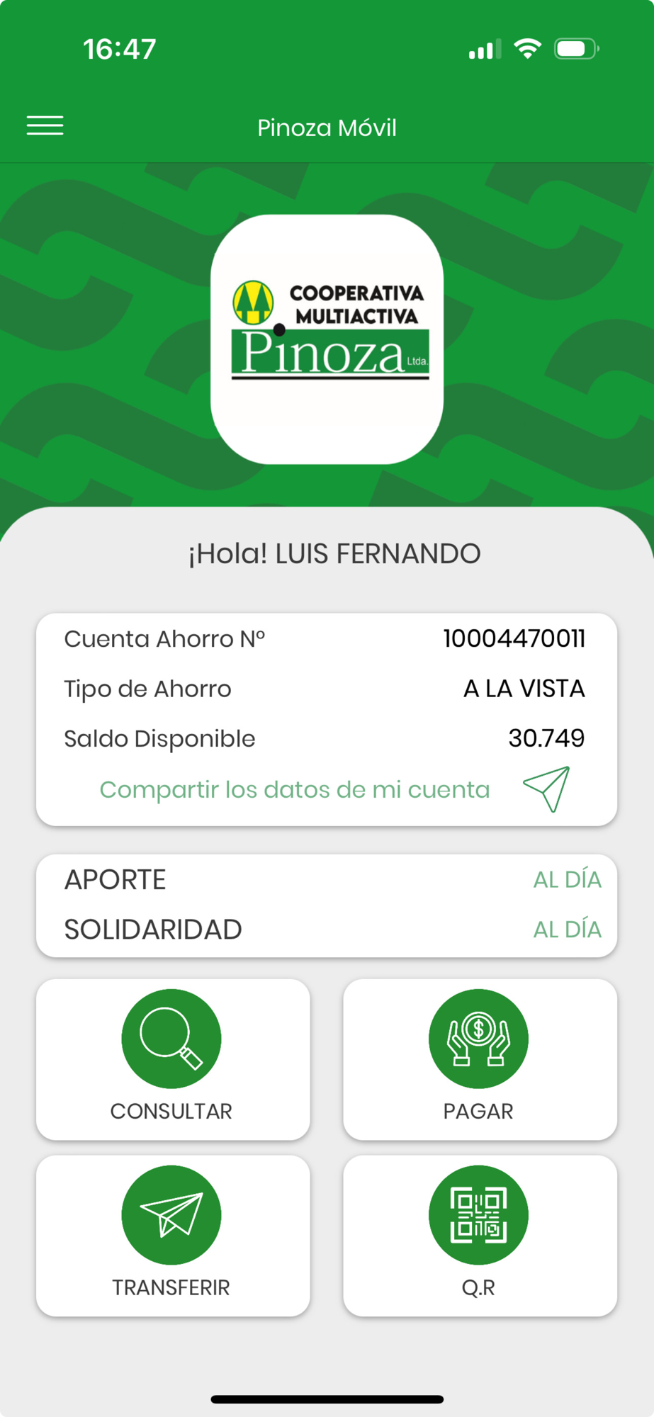 La aplicación de la Cooperativa Pinoza Ltda. es una plataforma virtual que brinda a los socios una experiencia financiera cómoda y autónoma. A través de esta app, los socios tienen la capacidad de realizar pagos de compromisos sociales y cuotas de créditos, tanto propios como de otros socios, de forma virtual y autogestionada, sin la necesidad de visitar la sucursal física de la cooperativa.