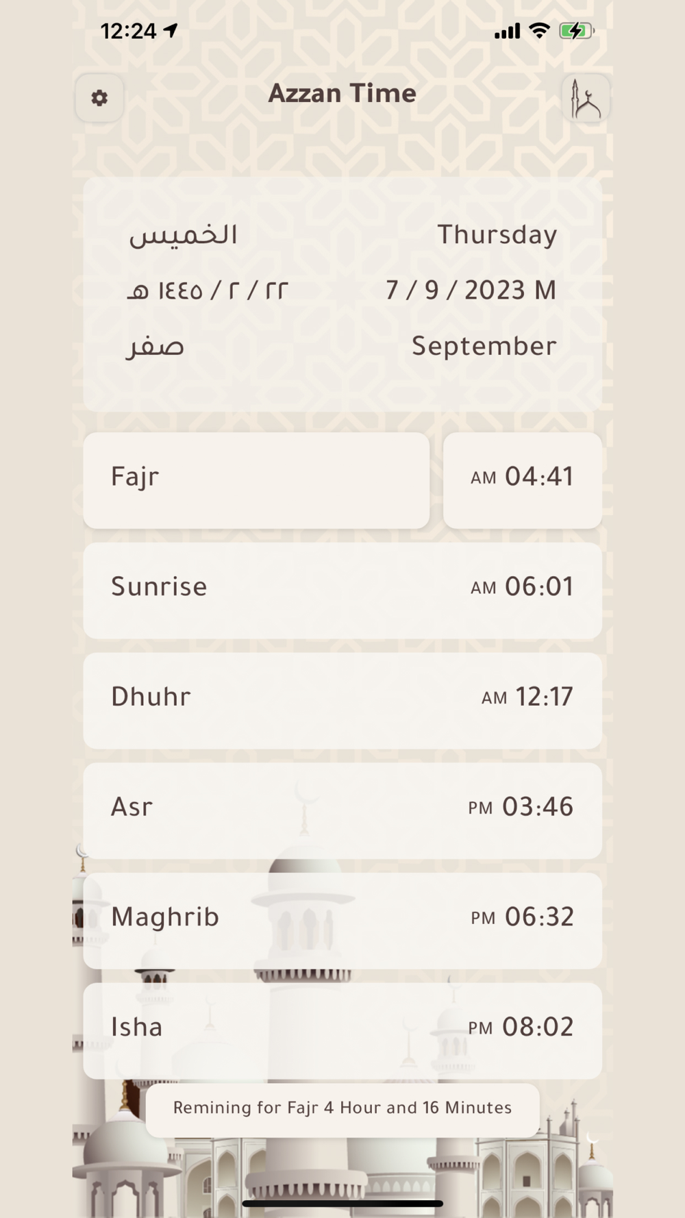 The app presents an accurate table of prayer times for the current day (and upcoming days soon). Prayer times are automatically updated daily based on the local time of the specified location. (The user can scroll through the days to view prayer times for upcoming days soon).