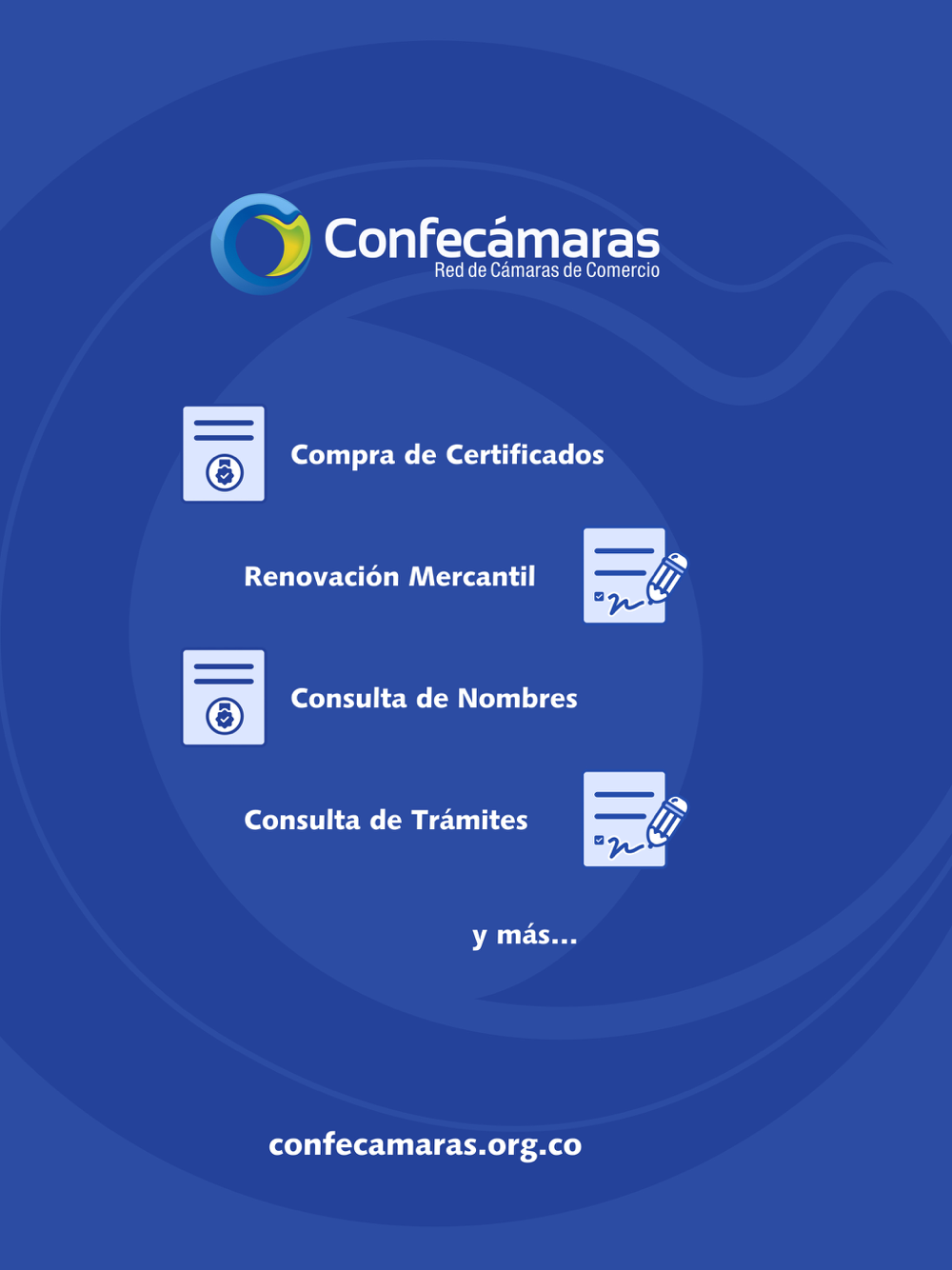 En esta app realiza tus trámites registrales desde un solo lugar, aquí encontrarás las diferentes Cámaras de Comercio disponibles. Confecámaras es un organismo de carácter nacional que coordina y brinda asistencia en el desarrollo de sus funciones a las Cámaras de Comercio colombianas.