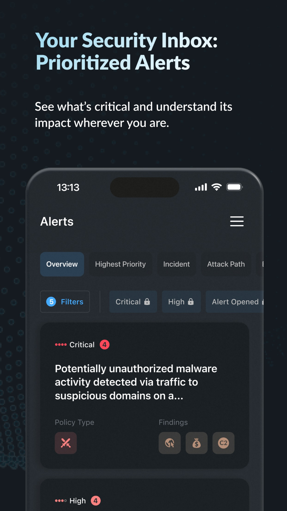 Prisma Cloud Mobile App revolutionizes cloud security management on the go. Our app delivers real-time notifications and updates, enabling you to stay informed and act promptly on critical security issues. The app offers a succinct visibility of key metrics, providing easy-to-interpret visuals and summaries to enhance your cloud security comprehension. From bringing in real time visbility to fostering team collaboration, our mobile app connects you to Prisma Cloud's robust functionalities, anytime, anywhere. Experience seamless cloud security management right at your fingertips.
