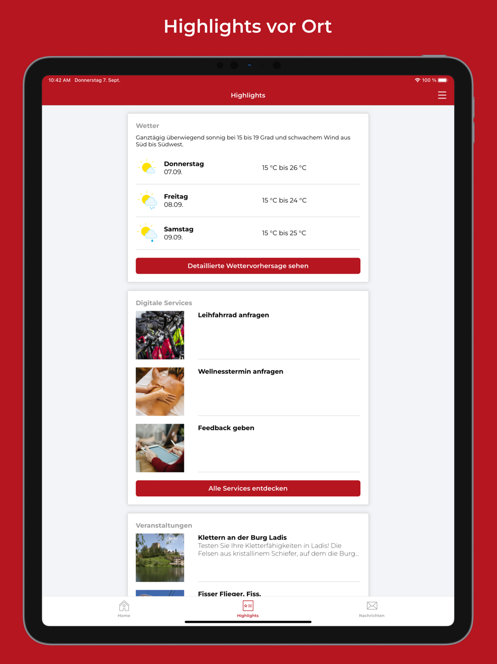 Zudem haben Sie mit unserer App nützliche Adressen und Telefonnummern, Infos zum öffentlichen Nahverkehr sowie aktuelle Wetterprognosen immer auf Ihrem Smartphone mit dabei.