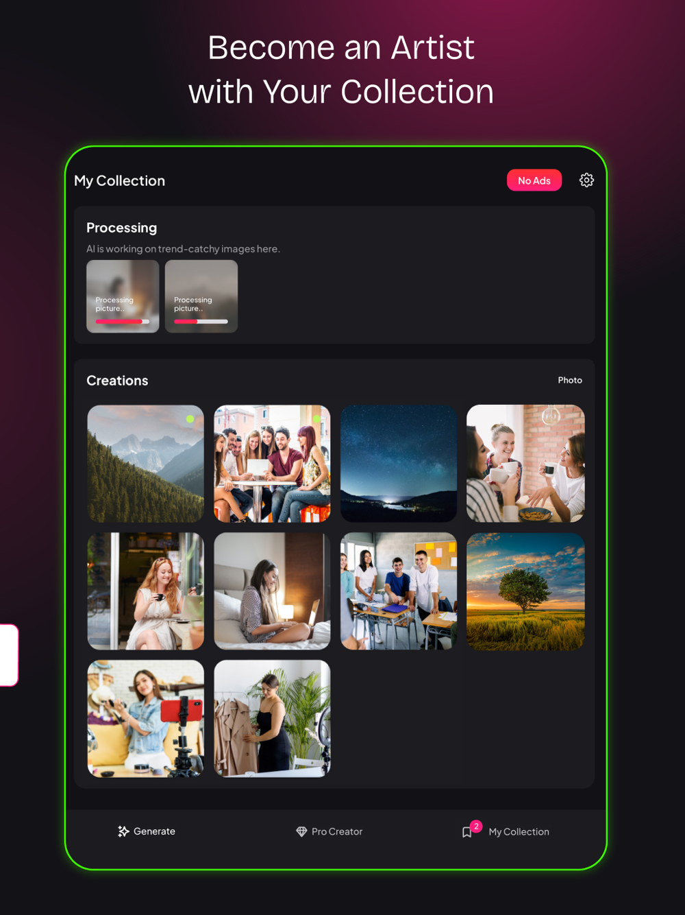 Experience real-time updates as our AI algorithms monitor social media, news, and online content to detect emerging trends. Your photos will evolve along with the world, making your feed the most engaging and up to date on the web.