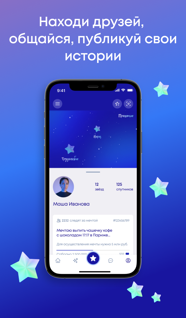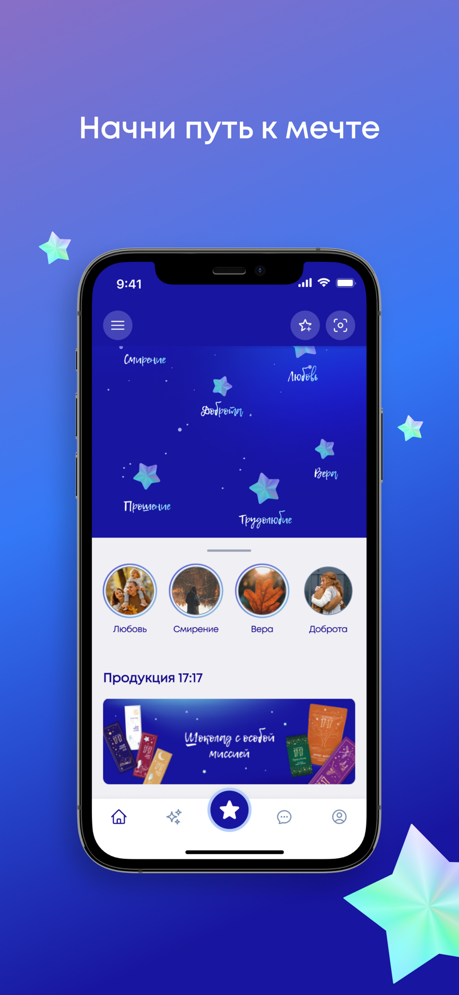 • открыть путь к мечте, состоящий из 12 звёзд-ценностей. Эти ценности помогут укрепить веру в мечту и двигаться вперед несмотря на трудности и неудачи. Научат радоваться возможности помогать другим и с благодарностью принимать поддержку и помощь, шаг за шагом приближая тебя к мечте.