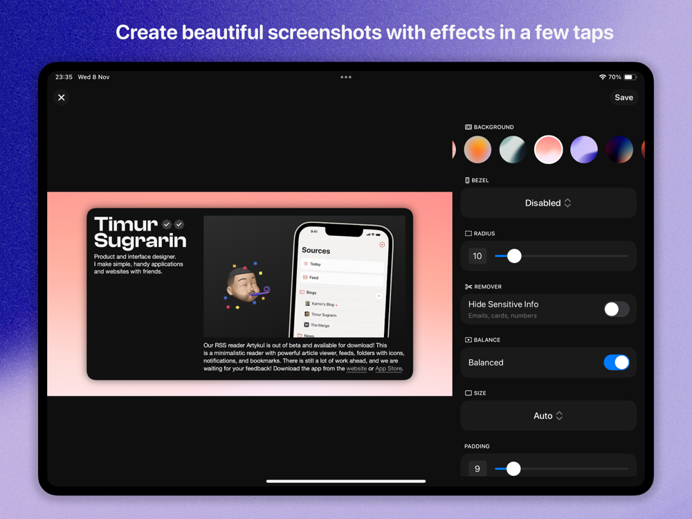 • Device Frames – Showcase your work inside the latest iPhone & iPad bezels.