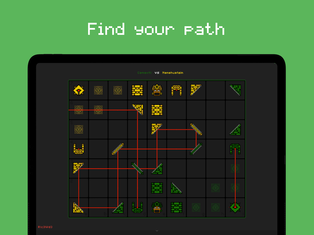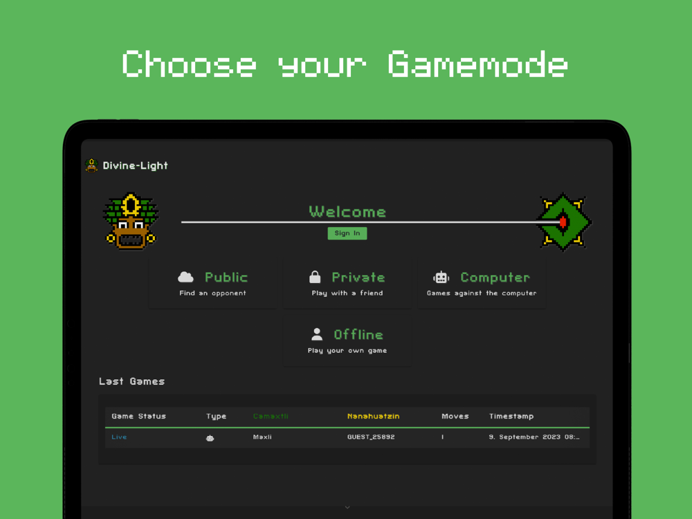 Camaxtli and Nanahuatzin have been battling each other for centuries in a unique strategic dimension. Divine-Light is a game with beams of light where the objective is to strike the opponent's king. Various pieces assist you in guiding the light across the game board. Improve your strategic thinking with Divine-Light and try to maintain an overview. Can you keep your king safe and break through the opponent's defense?