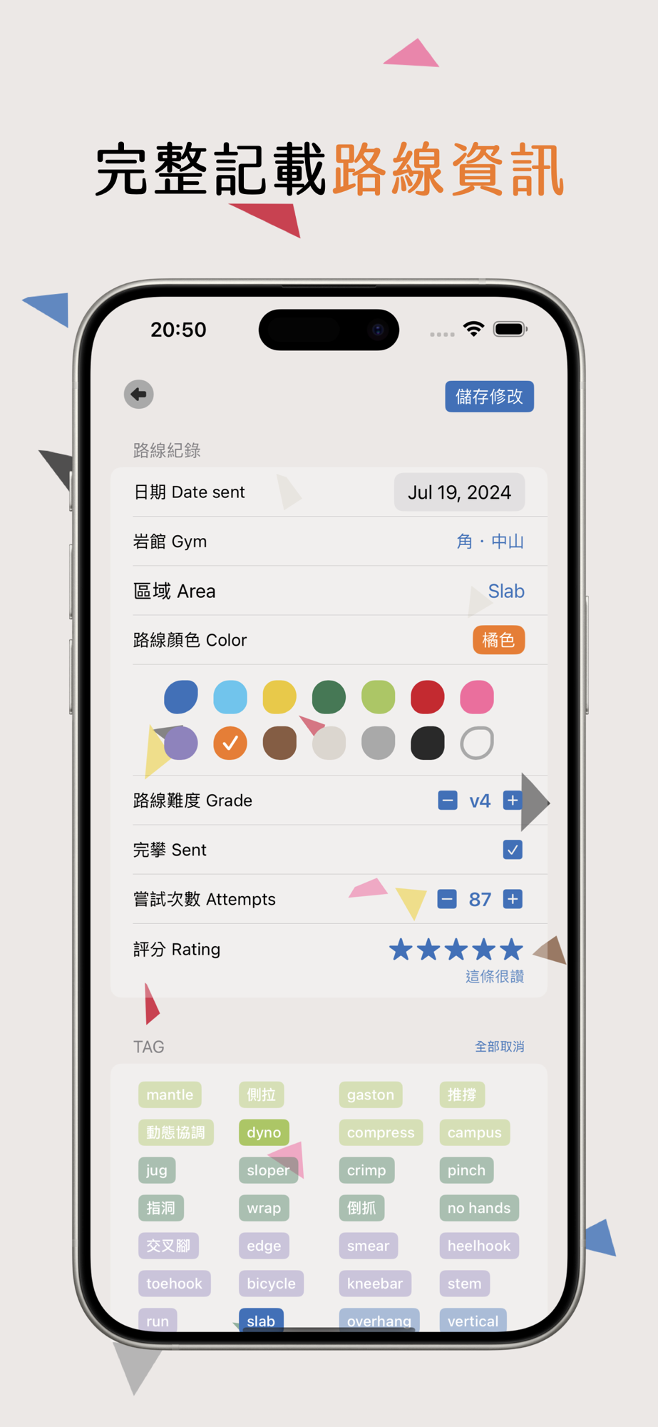 - 攀爬路線記錄:詳細記錄每一條攀爬路線的資訊,包括嘗試次數,及個人心得。