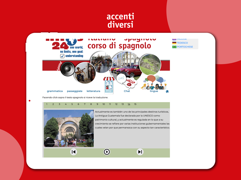 La sezione grammaticale è di tipo contrastivo. Ciò significa che vengono presi in considerazione i problemi specifici che i madrelingua italiani incontrano nell'apprendimento dello spagnolo. 600 pagine di grammatica con migliaia di frasi di esempio con audio e traduzione, esercizi interattivi, 120 canzoni composte appositamente per questo corso con musicisti provenienti da ogni angolo del mondo ispanofono, diversi romanzi significativi per il mondo ispanofono con traduzione e con audio, passeggiate virtuali, multimedia.