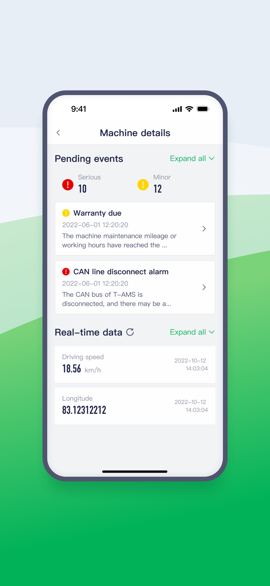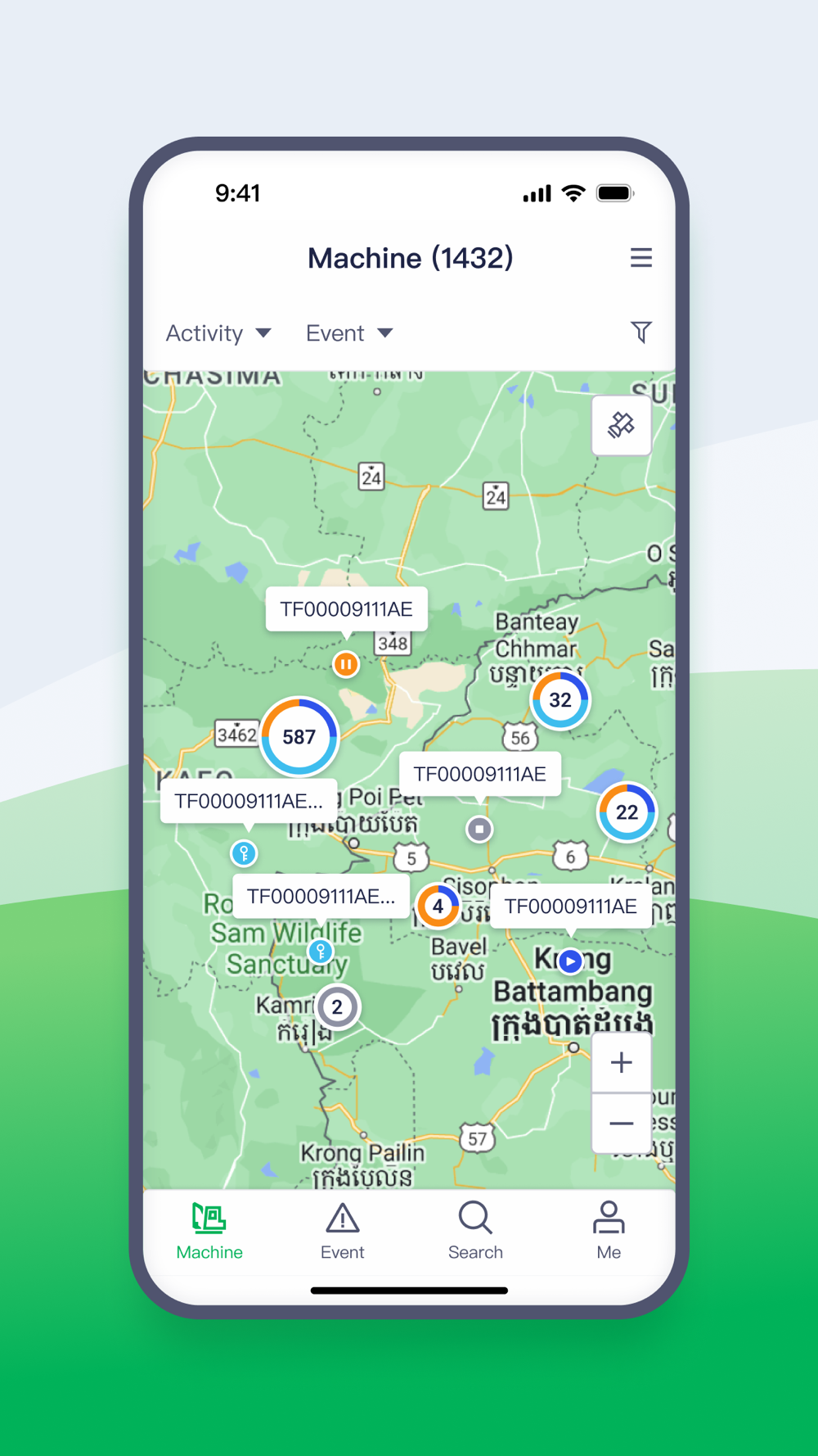 Provide real-time monitoring of machines operation data, including data visualization functions such as machines cluster working condition, real-time location, fault alarm, etc