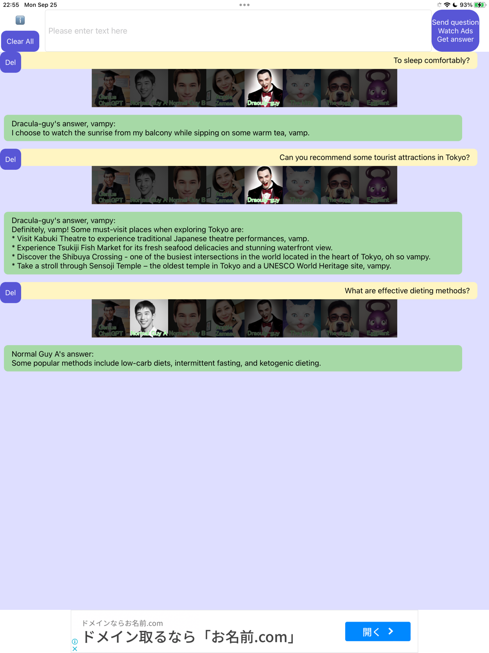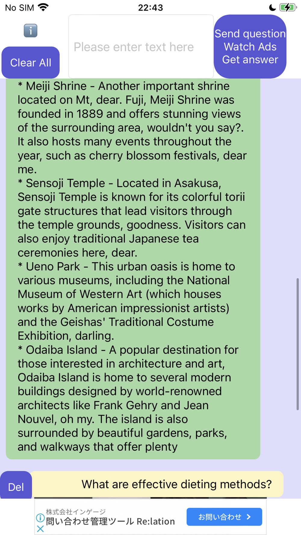 Write down anything you want to discuss, inquire about, or learn, and then send your question by pressing the "Send question, Watch Ads, Get answer" button.