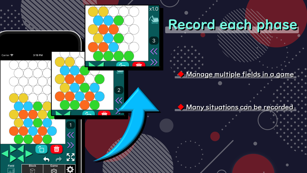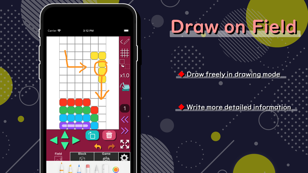 - In the "Field" tab, record detailed game progress by placing blocks, taking memos, and drawing.