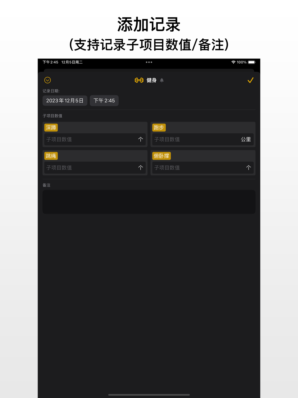 例如,一个健身项目包含:俯卧撑、深蹲、跑步等子项目,你可以在健身项目里面同时记录它们,DayMark 会自动统计俯卧撑、深蹲、跑步等子项目的记录数据。例如,做了多少个俯卧撑、跑步多少公里等。