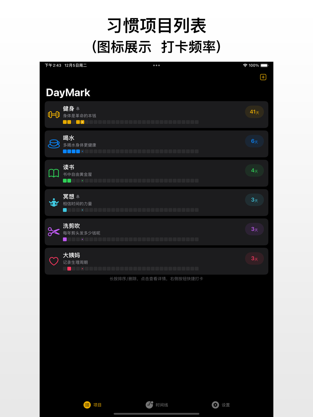DayMark 的最大特点是,支持在一个项目内创建多个子项目进行打卡记录。您可以在 DayMark 上面记录任何你想记录的事情,例如健身、学习、工作、经期记录等。