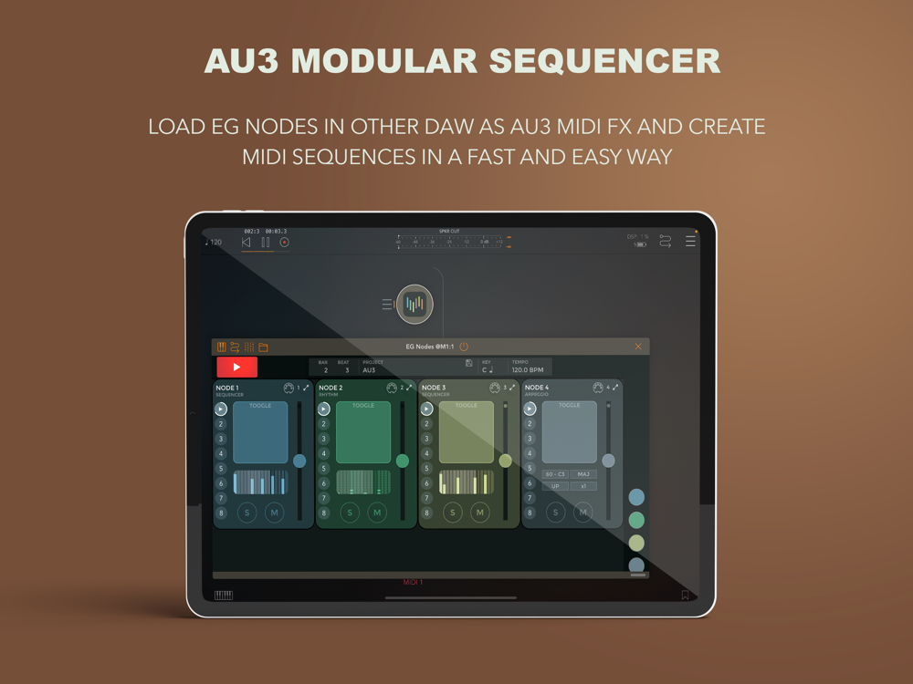 EG Nodes is a clip based Audio Unit host with sequencing capabilities to play external instruments, Audio Unit or MIDI hardware and create a complete audio project.