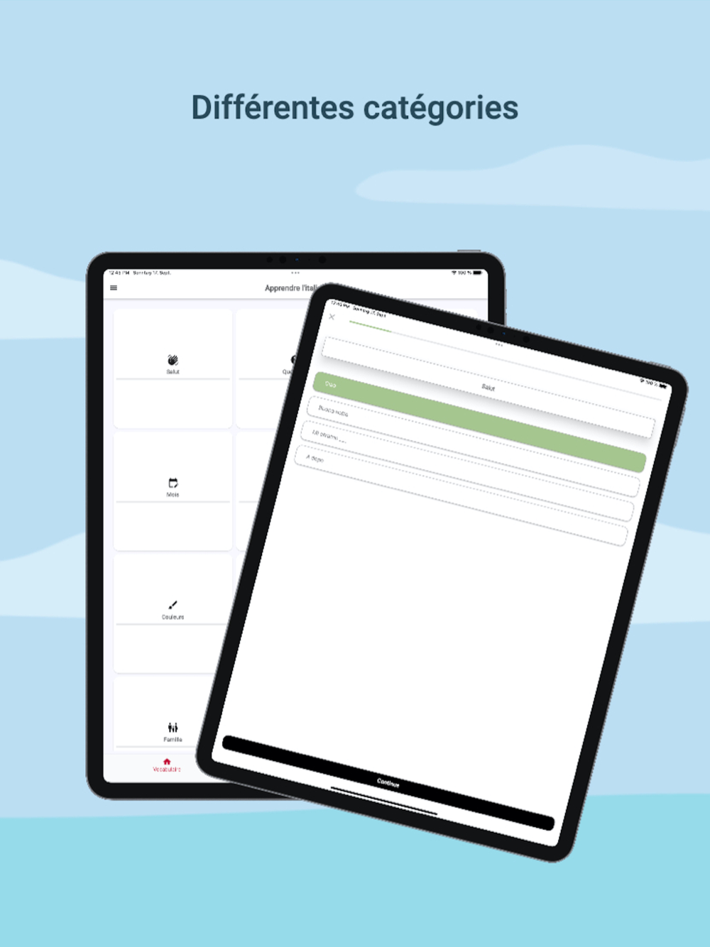 **Catégories variées : Nous proposons une gamme diversifiée de catégories pour vous aider à maîtriser l'italien, que ce soit pour voyager, travailler ou simplement pour le plaisir. Vous trouverez des mots et des phrases utiles dans chaque catégorie.