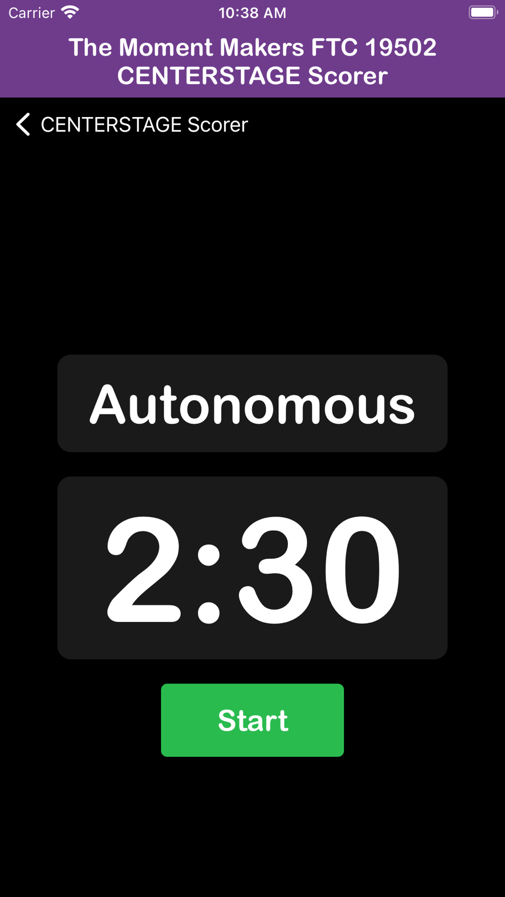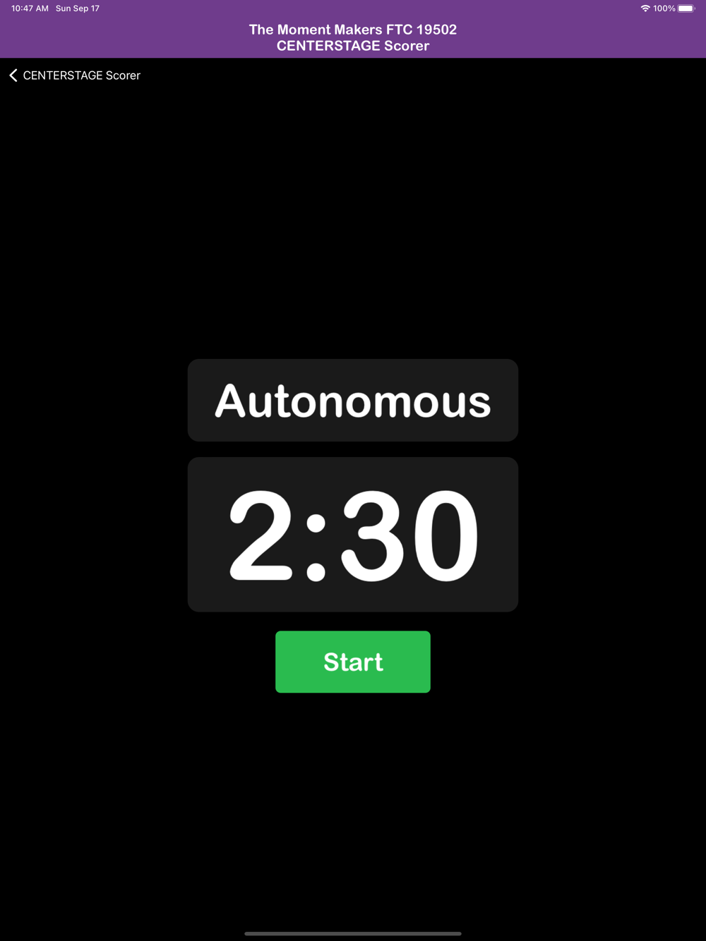 The main screen allows you to record points for the whole alliance, with the total points accumulated and penalties given to the opposing alliance displayed at the top. The timing screen shows the current time on the clock and plays match sounds. In addition, you can switch between the scoring and the timing screen to allow for real-time scoring; the timer and the sounds will continue to run in the scoring section of the app! The randomization screen will show you the randomized number, as well as the correct randomization scoring on both the spike marks and the backdrop.