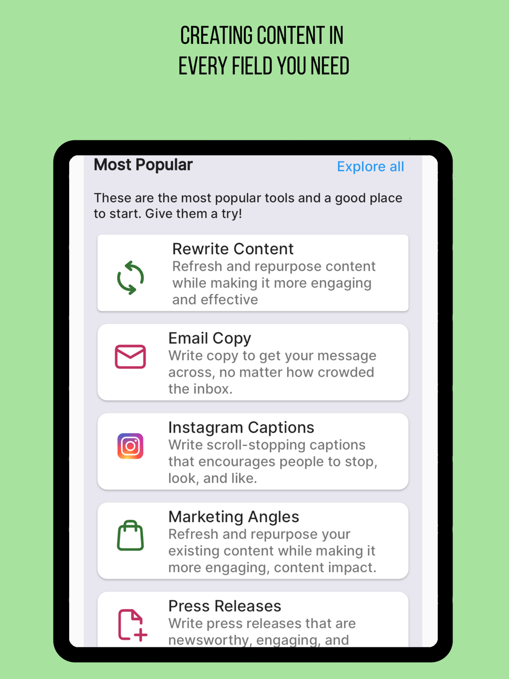 Content creation is now easier and more efficient with Copify.ai! Designed for content creators and entrepreneurs, this app speeds up text content production. Copify.ai enables you to generate original and attention-grabbing text for websites, blogs, social media posts, and more. With a vast database and artificial intelligence technology, Copify.ai provides tailored solutions for your content needs. Download now to simplify content creation and grow your business!