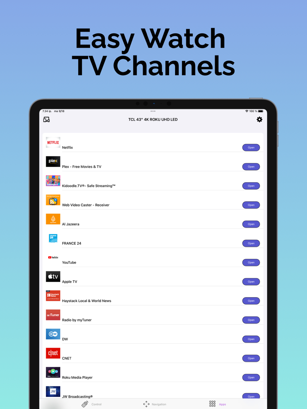 Transform your smartphone into a powerful remote control for your TV with the Smart TV Remote Control - the ultimate universal remote app. No more hunting for misplaced remotes or juggling multiple controllers; now, you can effortlessly manage your TV from your iPhone or iPad. Whether you own a Samsung TV, LG TV, Roku streaming stick, Philips, Panasonic, TCL Roku, Hisense, or any other brand, this app provides universal compatibility for all. Key Features: 1. Universal Compatibility: Seamlessly control your Samsung TV, LG TV, Roku, Philips, Panasonic, TCL Roku, Hisense, and more. 2. Easy Setup: Effortlessly connect your iPhone or iPad to your TV through the local network in just a few steps. 3. Full TV Control: TV remote power ON / OFF. Switch between AV and TV modes with your Samsung TV remote. Mute / Unmute your TV remote. Use Roku remote functionalities like Channel Digits buttons. Navigate through channel lists effortlessly. Adjust the volume conveniently with your LG TV remote. Seamlessly browse through channels. Access your TV menu with intuitive directional controls. Utilize colored soft keys (Red, Green, Blue, Yellow) for various functions with your universal remote for TV. 4. Smart TV Functionality: Enjoy additional functions of your Smart TV, including info, guide, and return. Enhance your media player experience with your TV remote. Take advantage of the virtual navigation pad for easy browsing. 5. Wi-Fi Connectivity: Connect your iPhone or iPad to your TV via the local Wi-Fi network, eliminating the need to be in close proximity to your television. 6. User-Friendly Interface: Our app boasts an intuitive design, ensuring easy navigation and usability. 7. Reliable and Policy Compliant: Rest assured, our app is thoroughly tested and complies with all policies. Please reach out to us via email if you encounter any issues before leaving a low rating. Disclaimer: This application is not sponsored by, endorsed by, or affiliated with Samsung, LG, Roku, Philips, Panasonic, TCL Roku, Hisense, or any other TV brand mentioned. It is an independent product designed to enhance your TV remote control experience. Experience the ultimate convenience of a universal remote control for your TV, whether it's a Samsung TV remote, LG TV remote, or Roku remote. Download Smart TV Remote Control today and simplify your TV-watching experience with seamless control, easy setup, and universal compatibility. Say goodbye to remote clutter and hello to a stress-free TV control experience!
