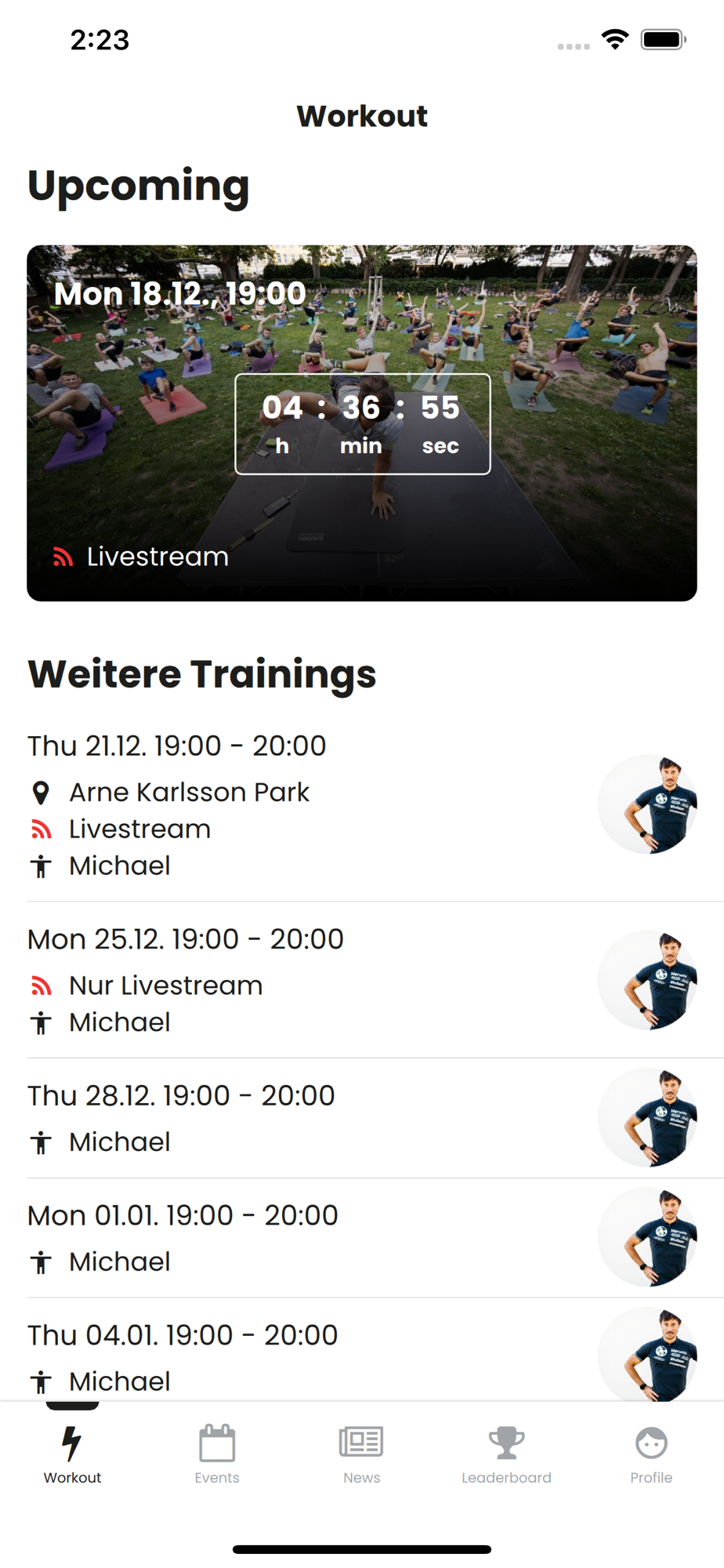 Einige Trainings sind auch per Livestream verfügbar, achte auf das Stream-Symbol.