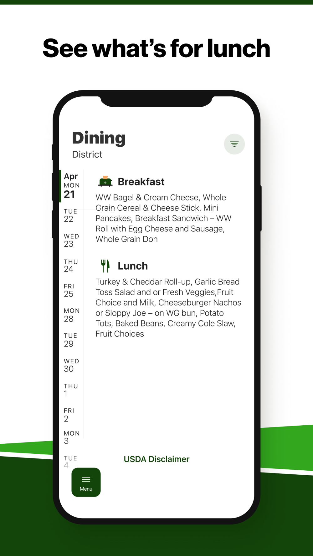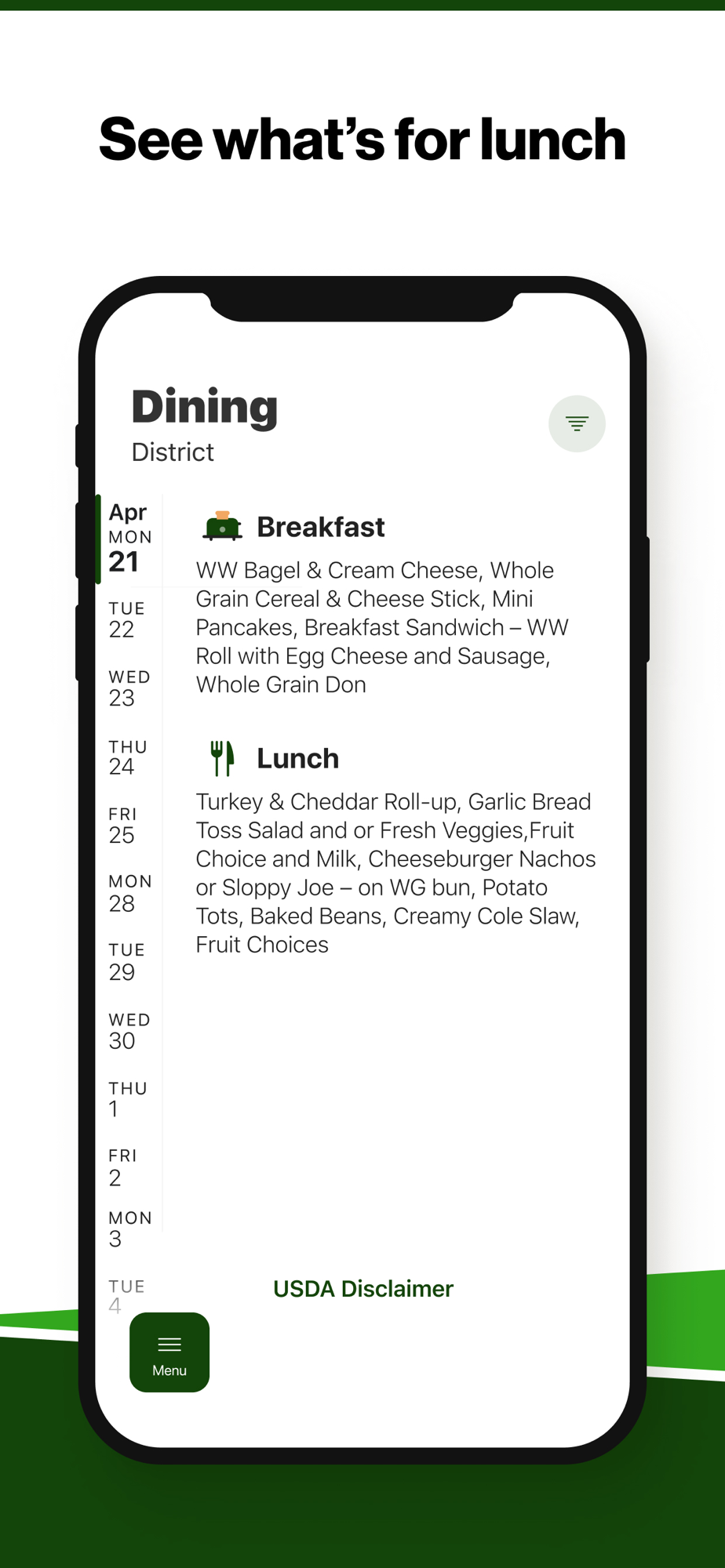 Within the dining section, you’ll find an easy to navigate, weekly menu, sorted by day and meal type.
