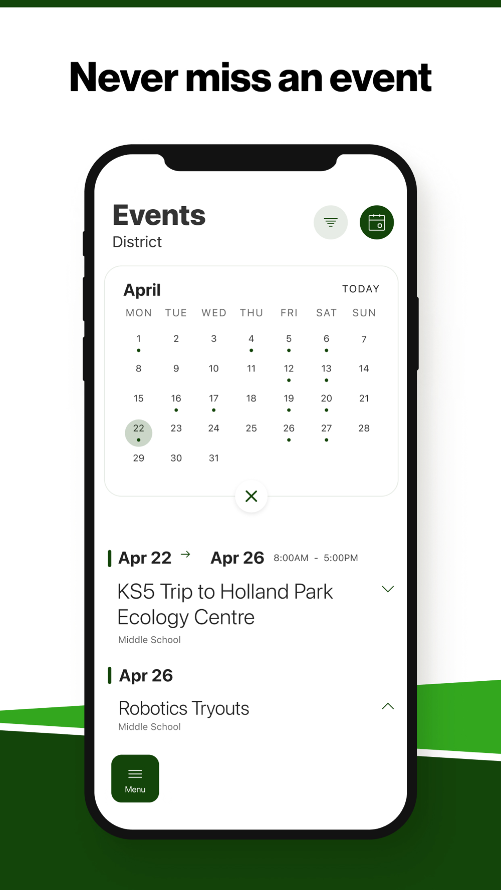 The event section shows a list of events throughout the district. Users can add an event to their calendar to share the event with friends and family with one tap.