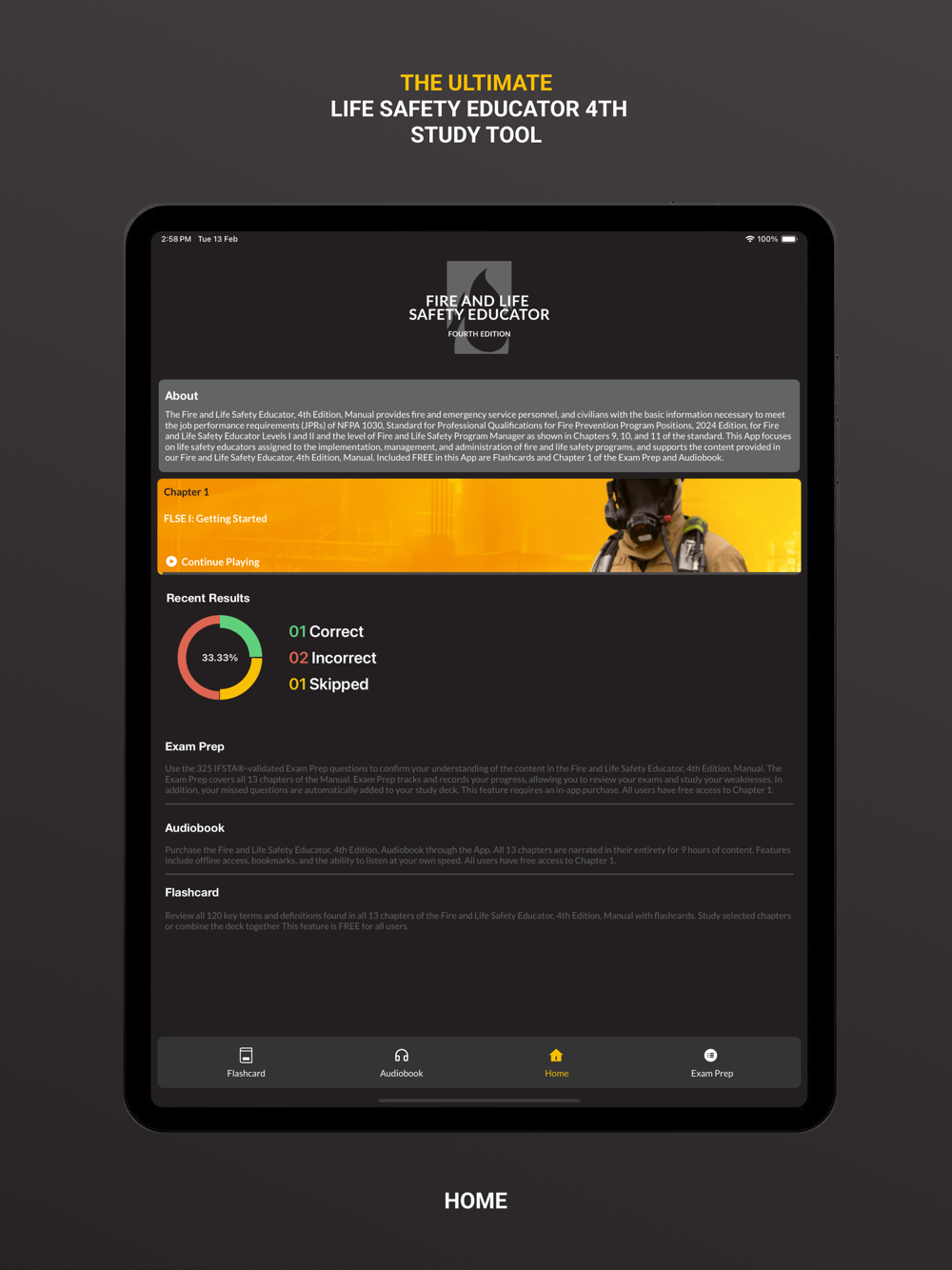 Use the 325 IFSTA®-validated Exam Prep questions to confirm your understanding of the content in the Fire and Life Safety Educator, 4th Edition, Manual. The Exam Prep covers all 13 chapters of the Manual. Exam Prep tracks and records your progress, allowing you to review your exams and study your weaknesses. In addition, your missed questions are automatically added to your study deck. This feature requires an in-app purchase. All users have free access to Chapter 1.