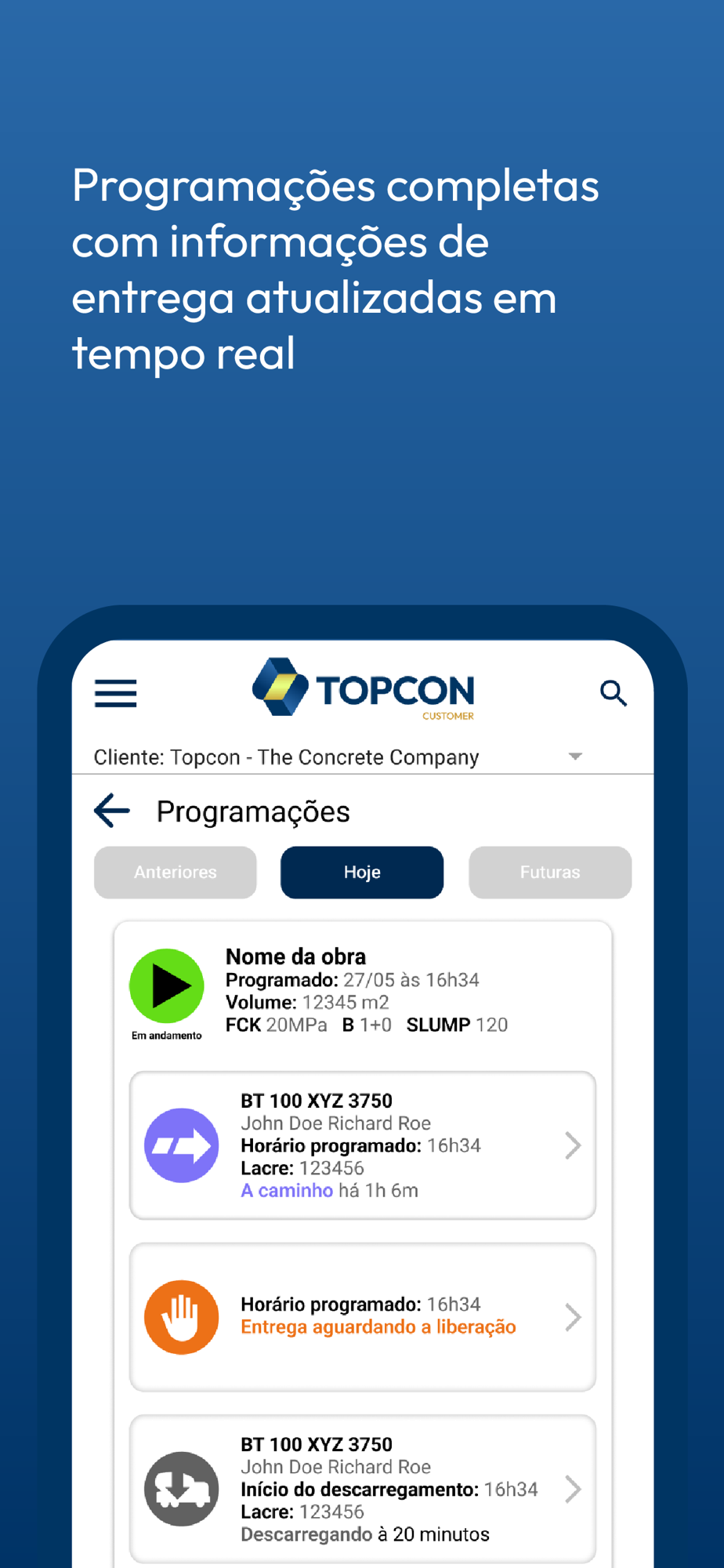 Através de uma interface simples e intuitiva, o TOPCON CUSTOMER permite gerenciar a entrega do concreto com indicadores de solicitação de programação, situação de cada entrega, laudos e tecnologia do concreto, pagamentos e situações de faturas, permitindo assim a tomada de decisões e evitando ociosidade no processo logístico.