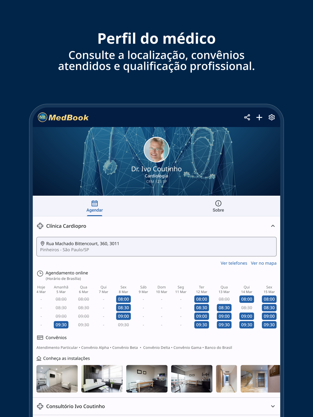 O MedBook reúne todas as informacões do seu especialista de confiança para você ver os horários disponíveis e agendar suas consultas.