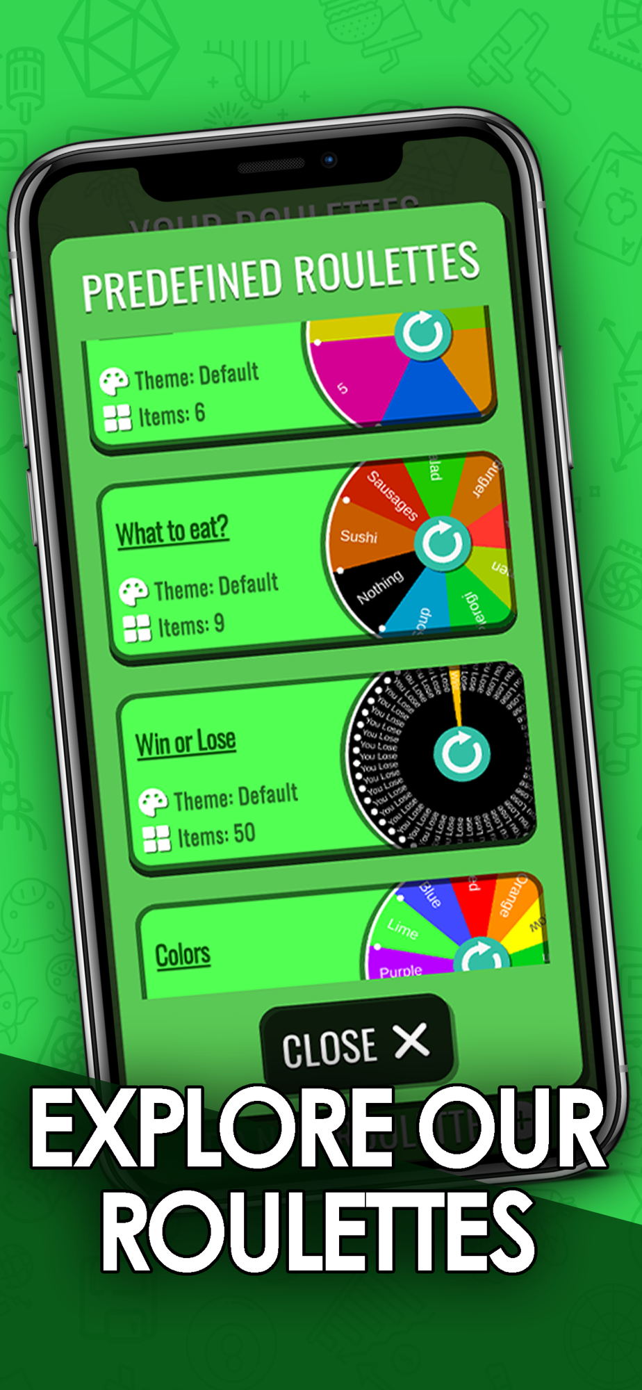 Spin Wheel - Decision Roulette assists you in selecting among the different options provided. You can enter up to 50 options in various roulettes and use them anytime you like. The data is only kept on the device and is not stored in the cloud.