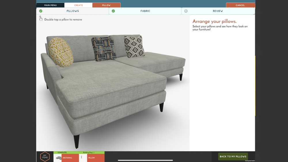 Once you’ve created your sofa or sectional, accessorize away with Sofa POP, an irresistible collection of must-have accent pieces – chairs, ottomans and pillows – which pair perfectly with your new furniture to make your entire room pop. You can even layer pillows onto your furniture with a simple tap to visualize your whole look. Obsessed.