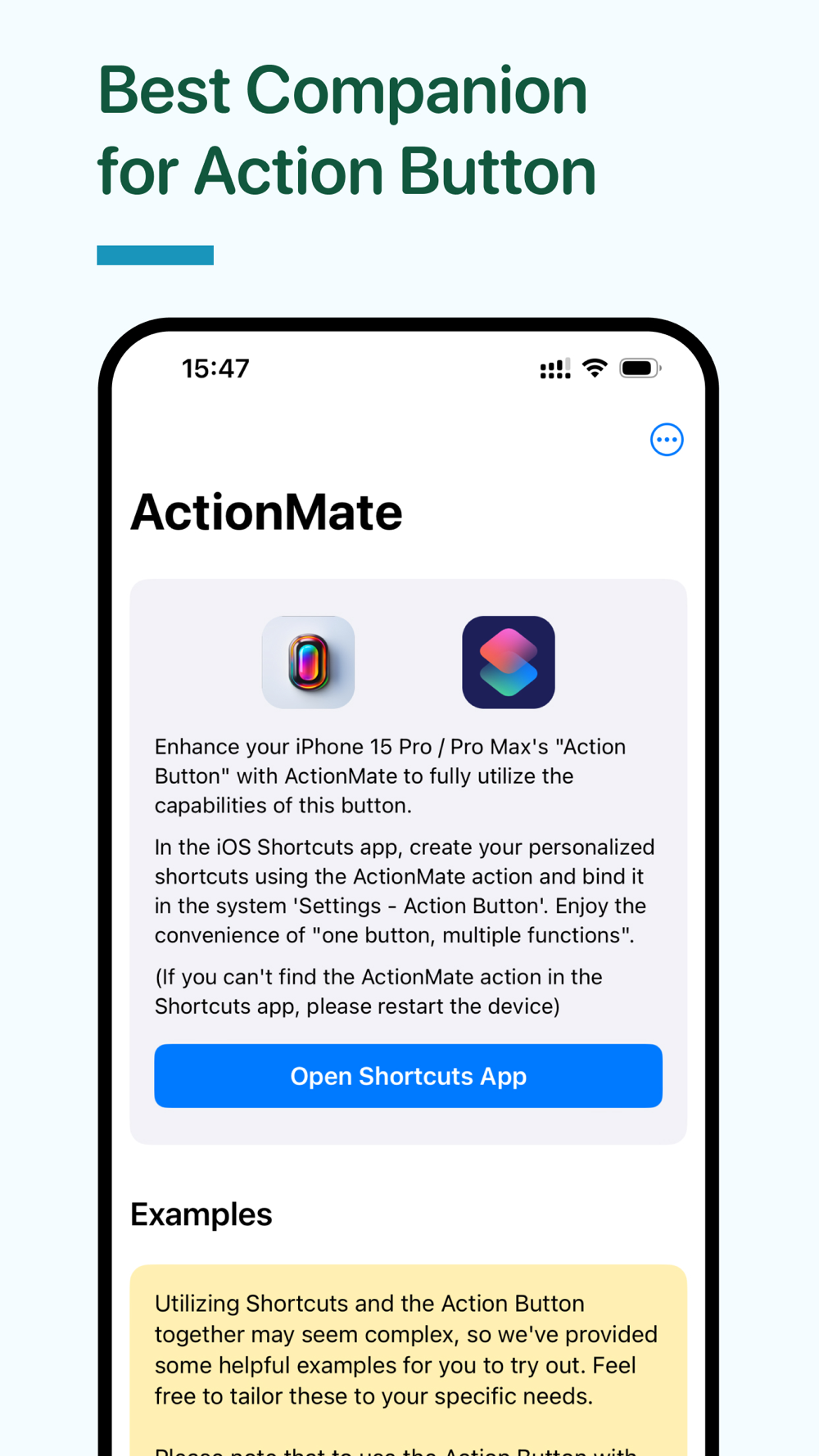 ActionMate is a practical tool designed to enhance the usage of Action Button in conjunction with the Shortcut app.