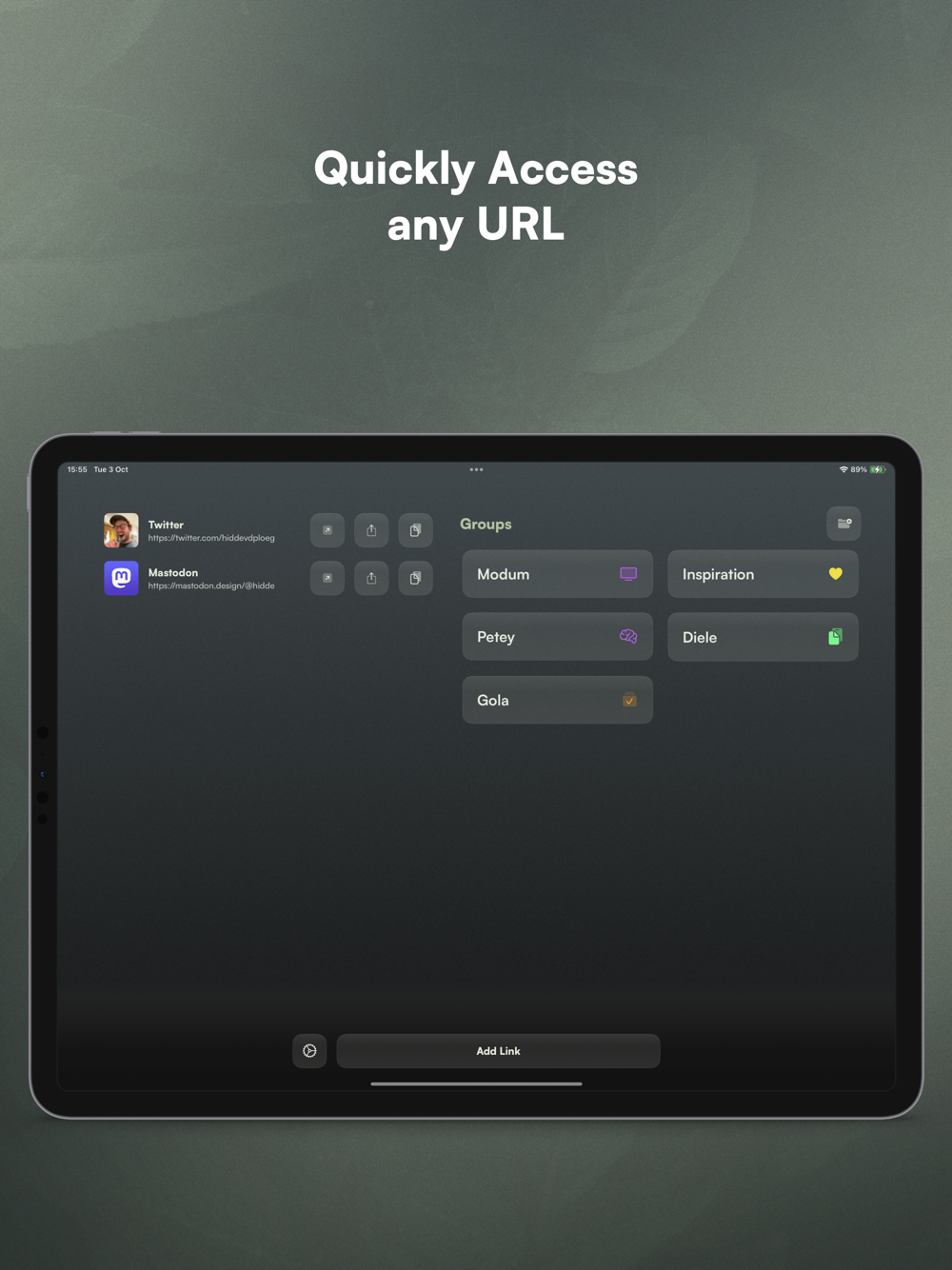 Diele makes adding links as frictionless as possible. Quickly type any link or add that URL from your pasteboard with a single button press. Alternatively, you can add links via Shortcuts, share sheets or simply drag and drop a URL into Diele to add. Easy.