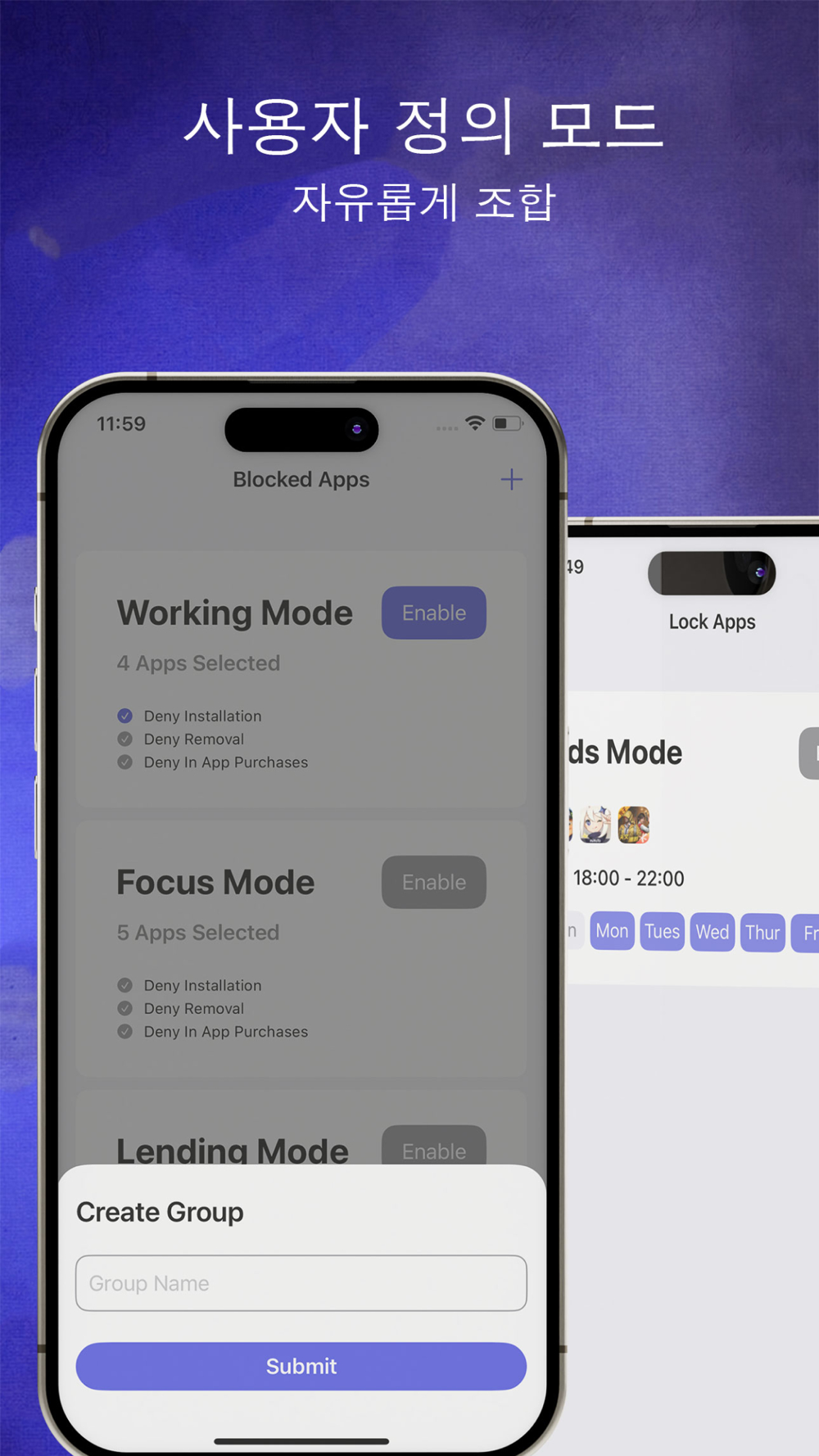 - 맞춤형 모드: 앱 잠금은 맞춤형 모드를 제공하여 필요에 따라 특정 가정 관리 및 개인정보 보호 규칙을 설정할 수 있습니다.