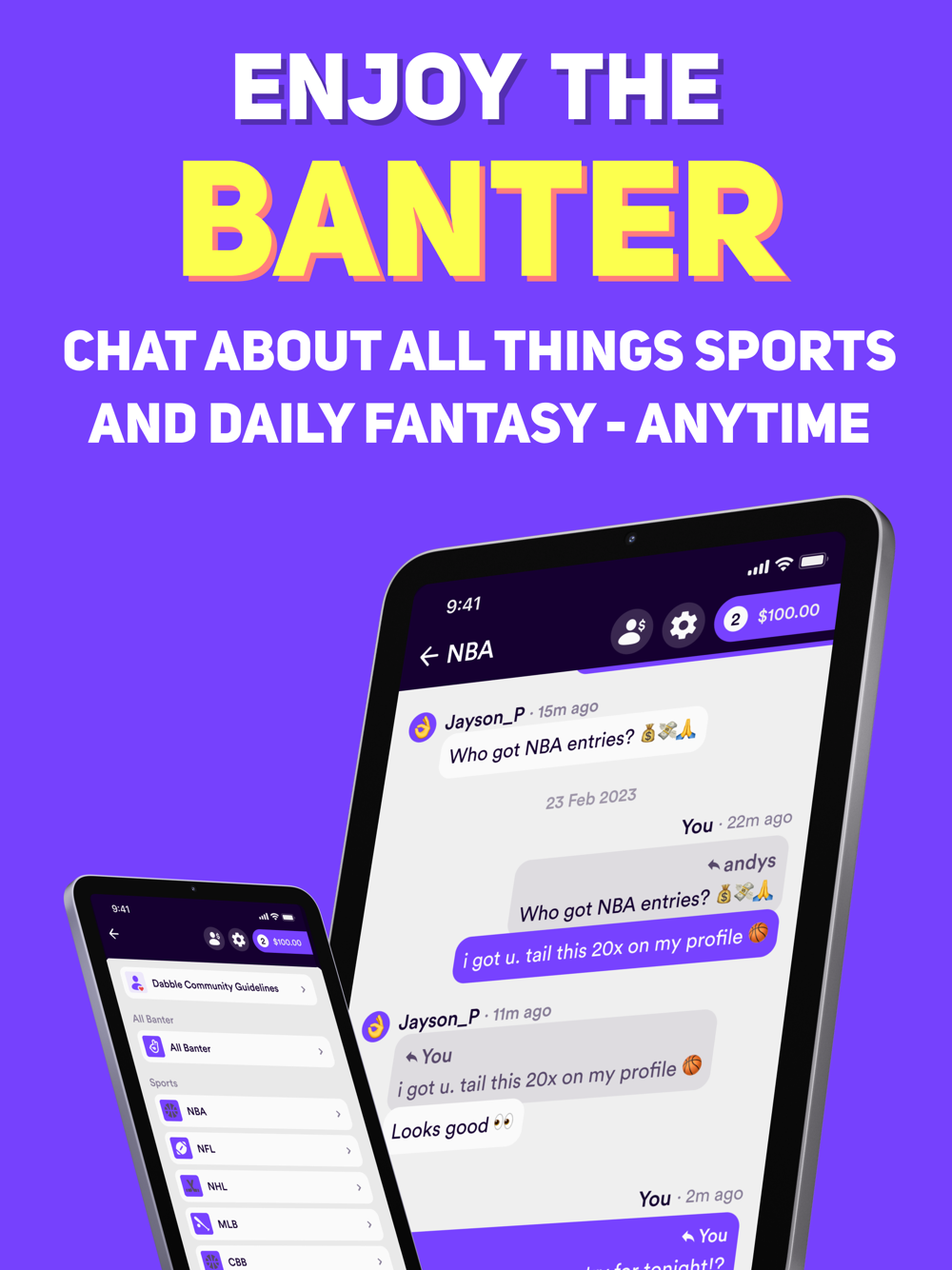 Dabble has everything you love about your existing real money DFS apps, plus a heap more that you won't find anywhere else. You can FOLLOW, CHAT & COPY picks from other users, including DFS experts and sports stars. There’s no other Pick 'Em community like Dabble.