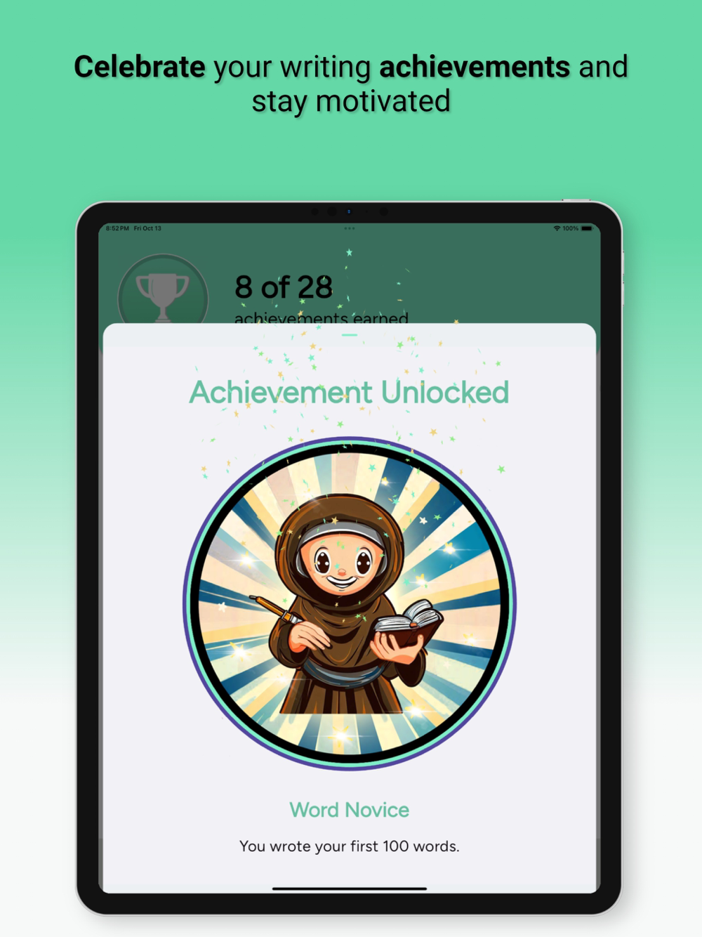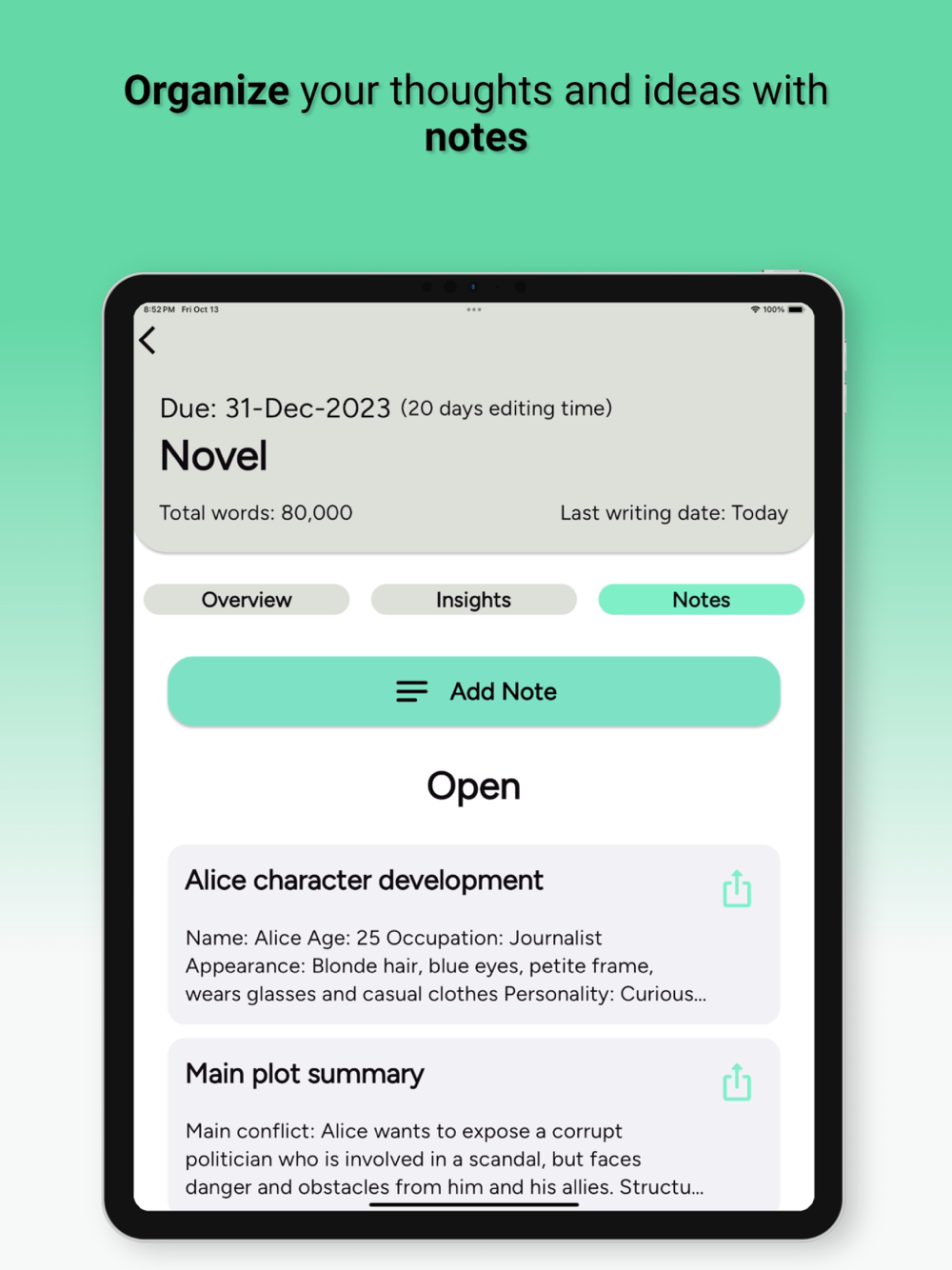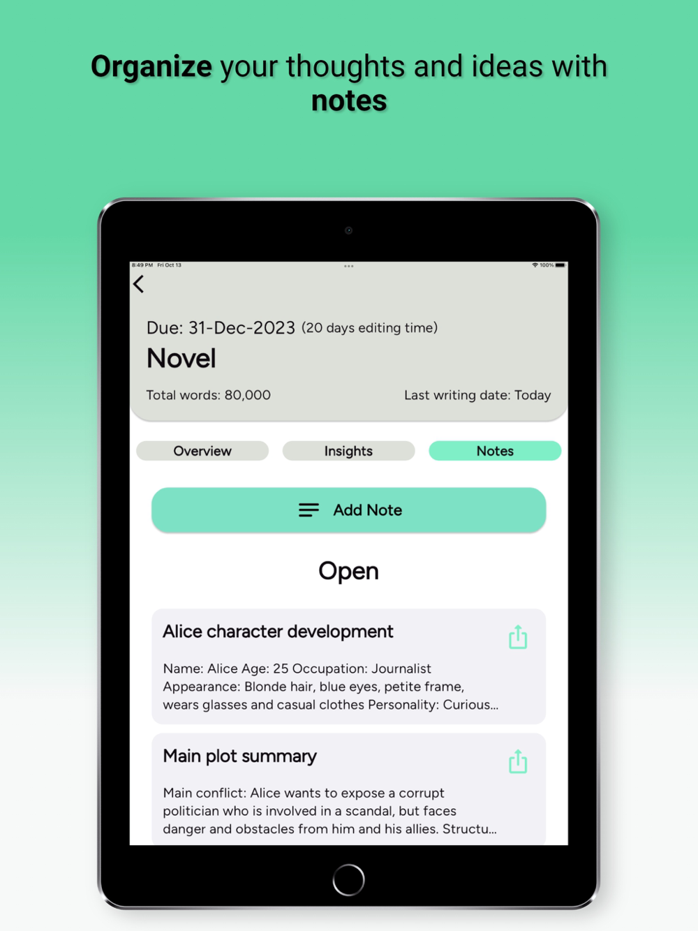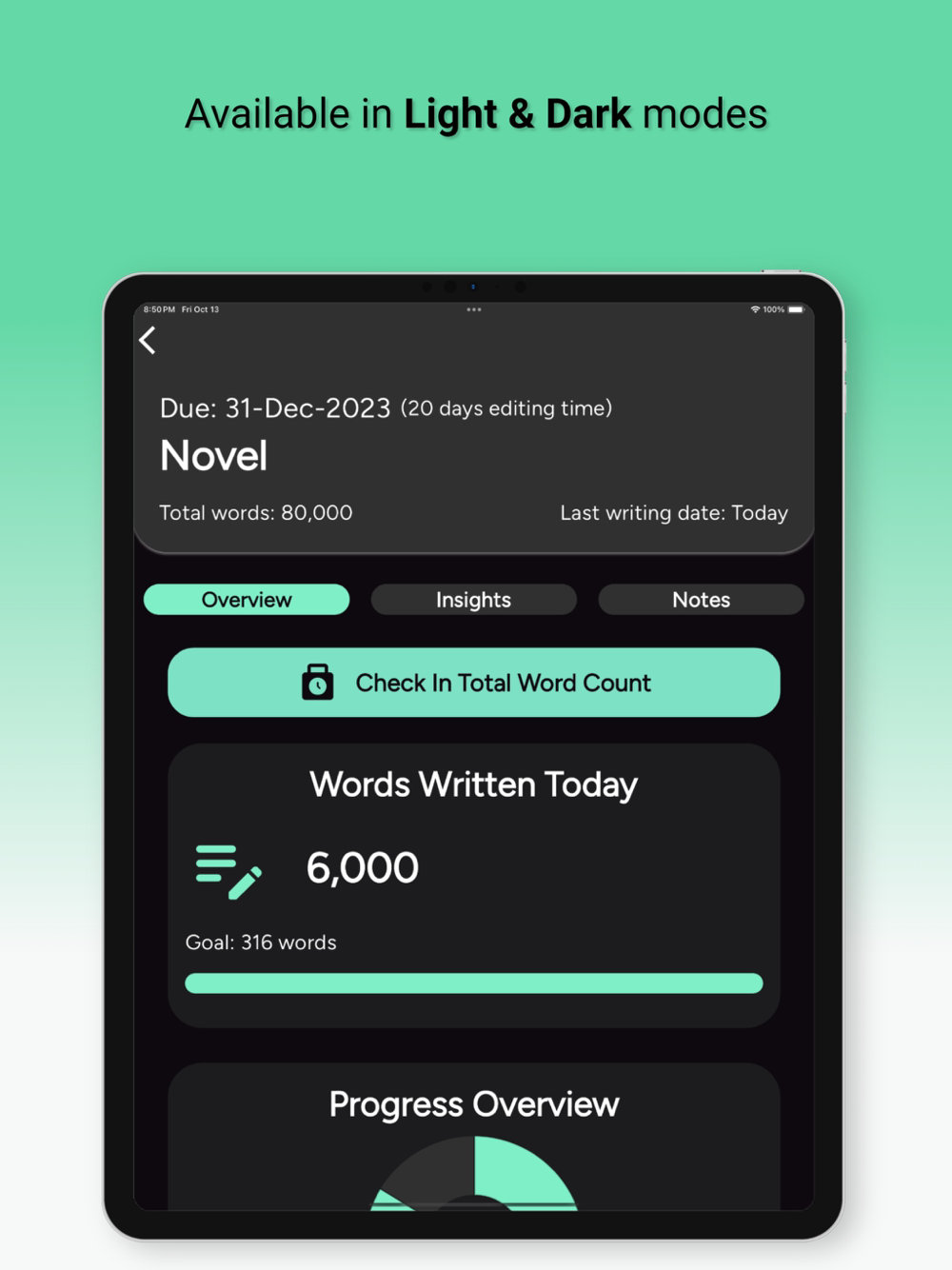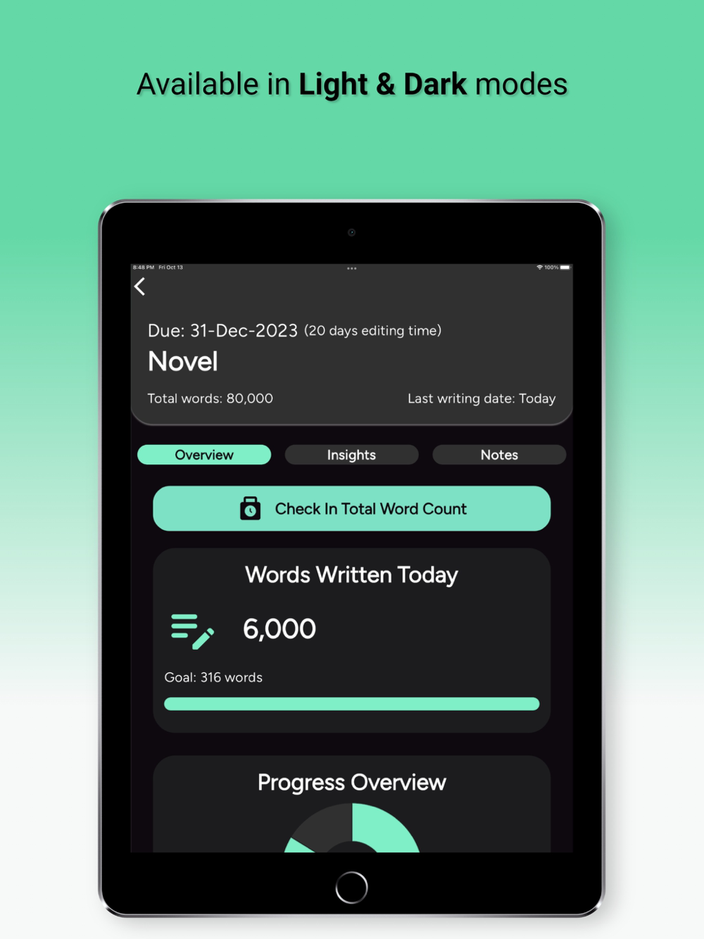 • View your writing insights such as total words, average words per day, writing streaks, and more