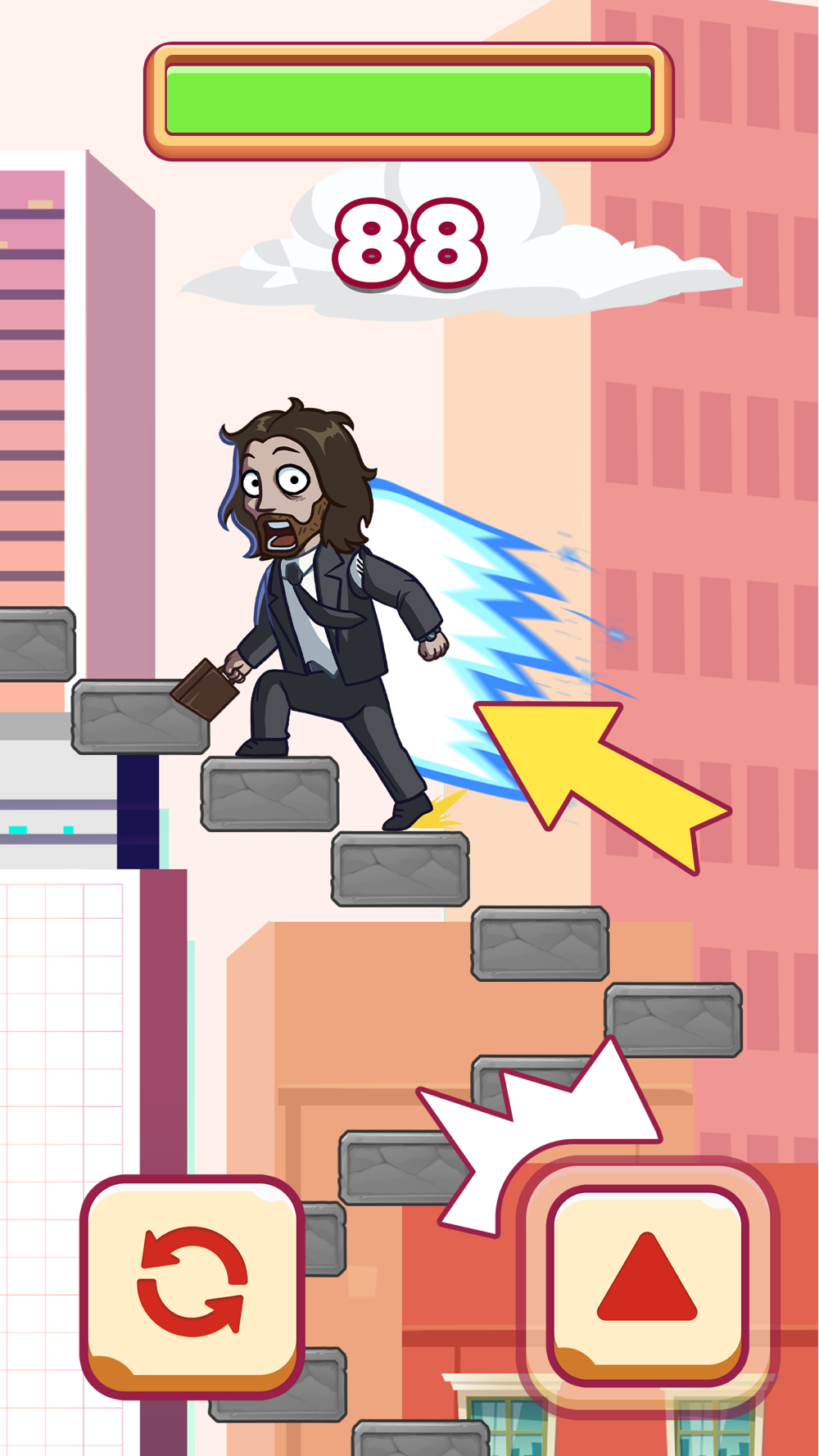 Meet our main character, a bored salary man who has been waiting his whole life for a marvelous adventure up to the sky. He is about to embark on a journey through Stairs Climb that takes him to where no ride has ever been before.