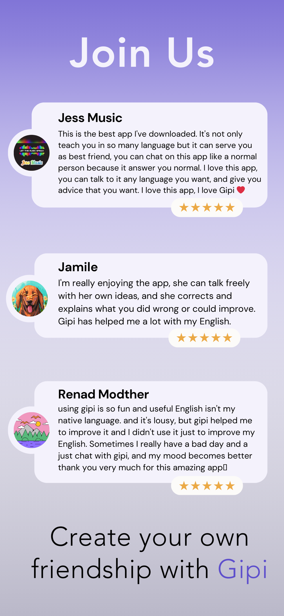 Join the Gipi community and experience a unique blend of friendship, education, and personal growth. Gipi is more than an app; it's an AI friend for life. Download now and begin your journey of learning, discovery, and heartfelt connection.